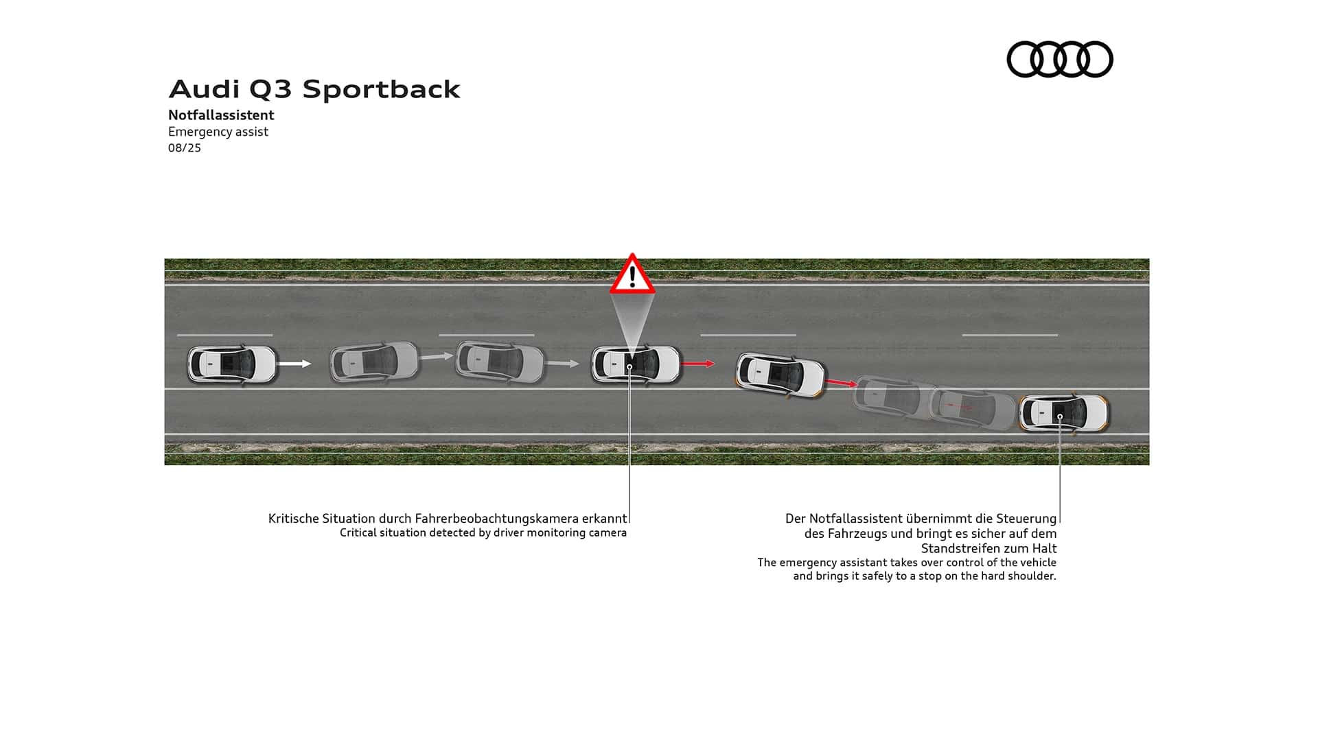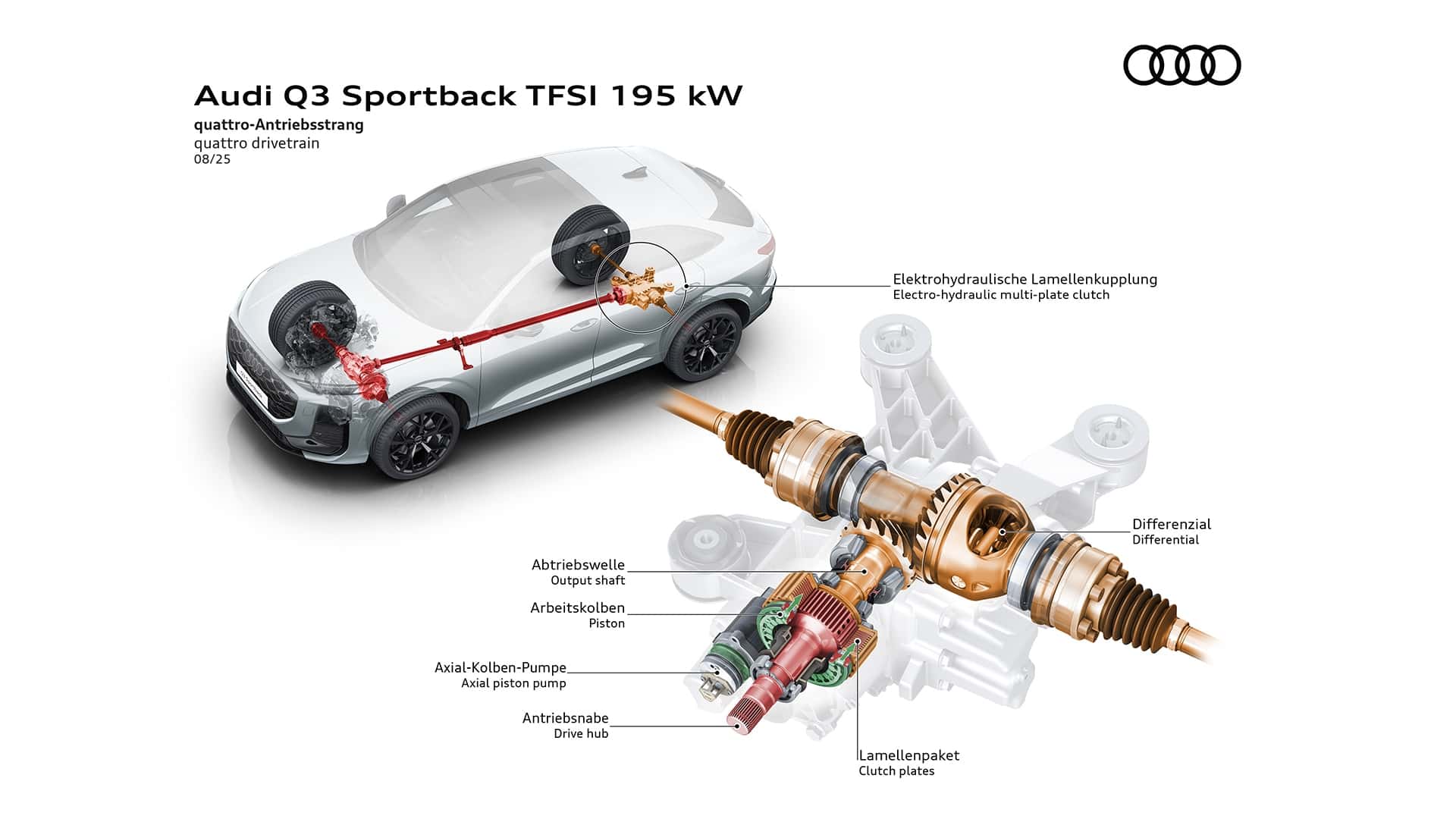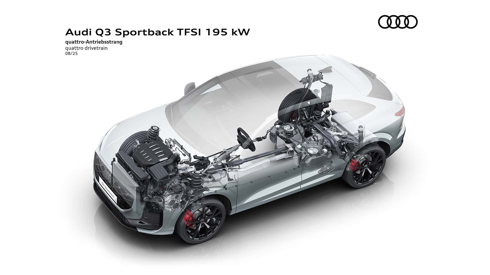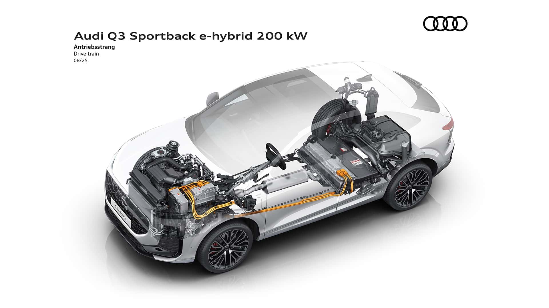 تُنتج سيارة Q3 Sportback e-hybrid (هجينة قابلة للشحن) قوة إجمالية تبلغ 200 كيلوواط (272 حصانًا). تبلغ سعة البطارية عالية الجهد 25.7 كيلوواط/ساعة (صافي 19.7 كيلوواط/ساعة)، مما يُمكّنها من قطع مسافة تصل إلى 118 كيلومترًا (73 ميلًا) باستخدام الطاقة الكهربائية وفقًا لاختبار WLTP.