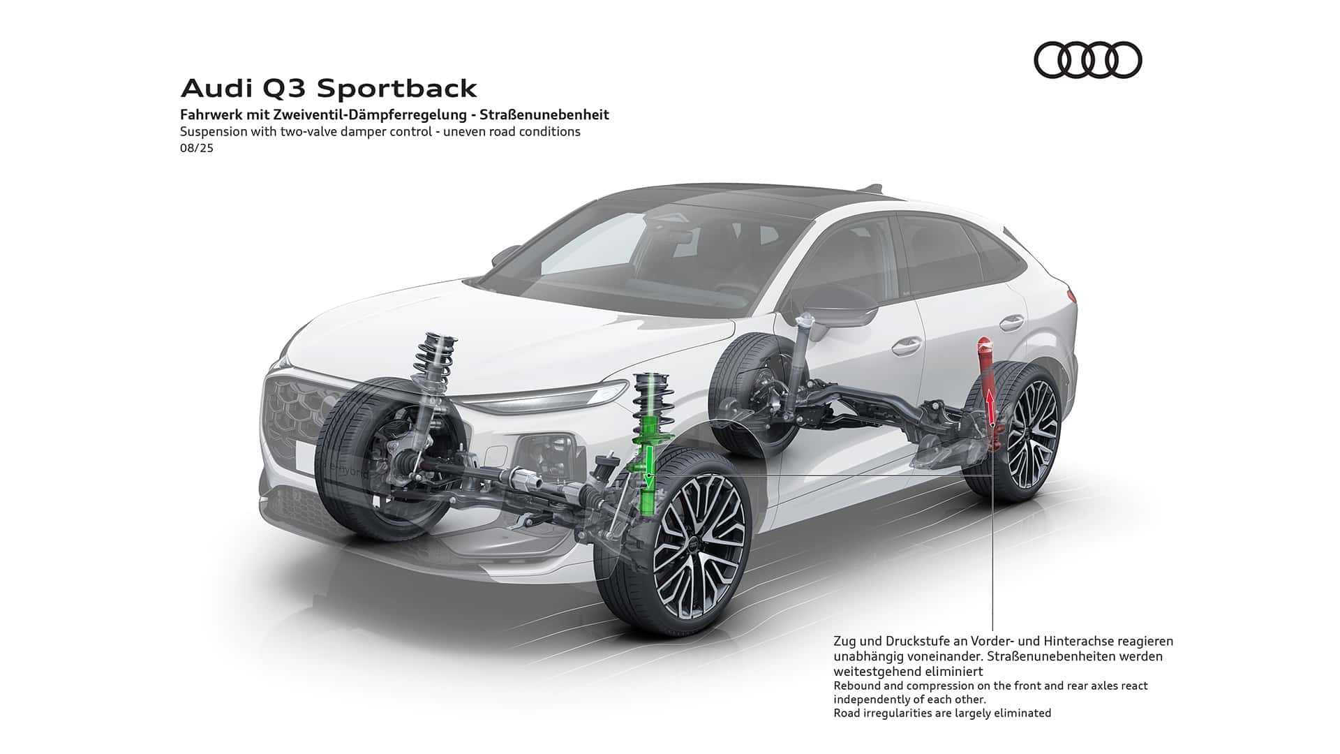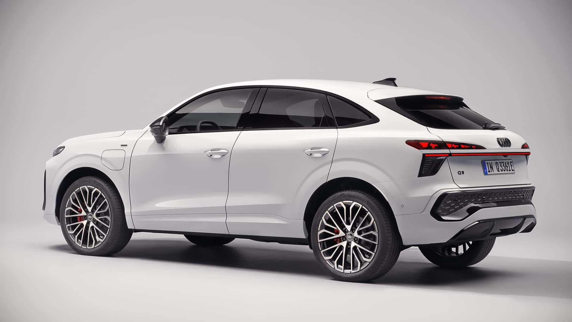 يقدم طراز S line مصدات أمامية وخلفية مميزة وقطع زينة إضافية باللون الفضي سيلينيت. كما تتوفر باقة خارجية باللون الأسود. ستتوفر سيارة Audi Q3 Sportback بـ 11 لونًا: الأخضر الرمادي والبني ماديرا غير اللامع، وإضافات جديدة. تتراوح قياسات العجلات بين 18 و20 بوصة، وعرض الإطارات بين 215 و235 ملم.