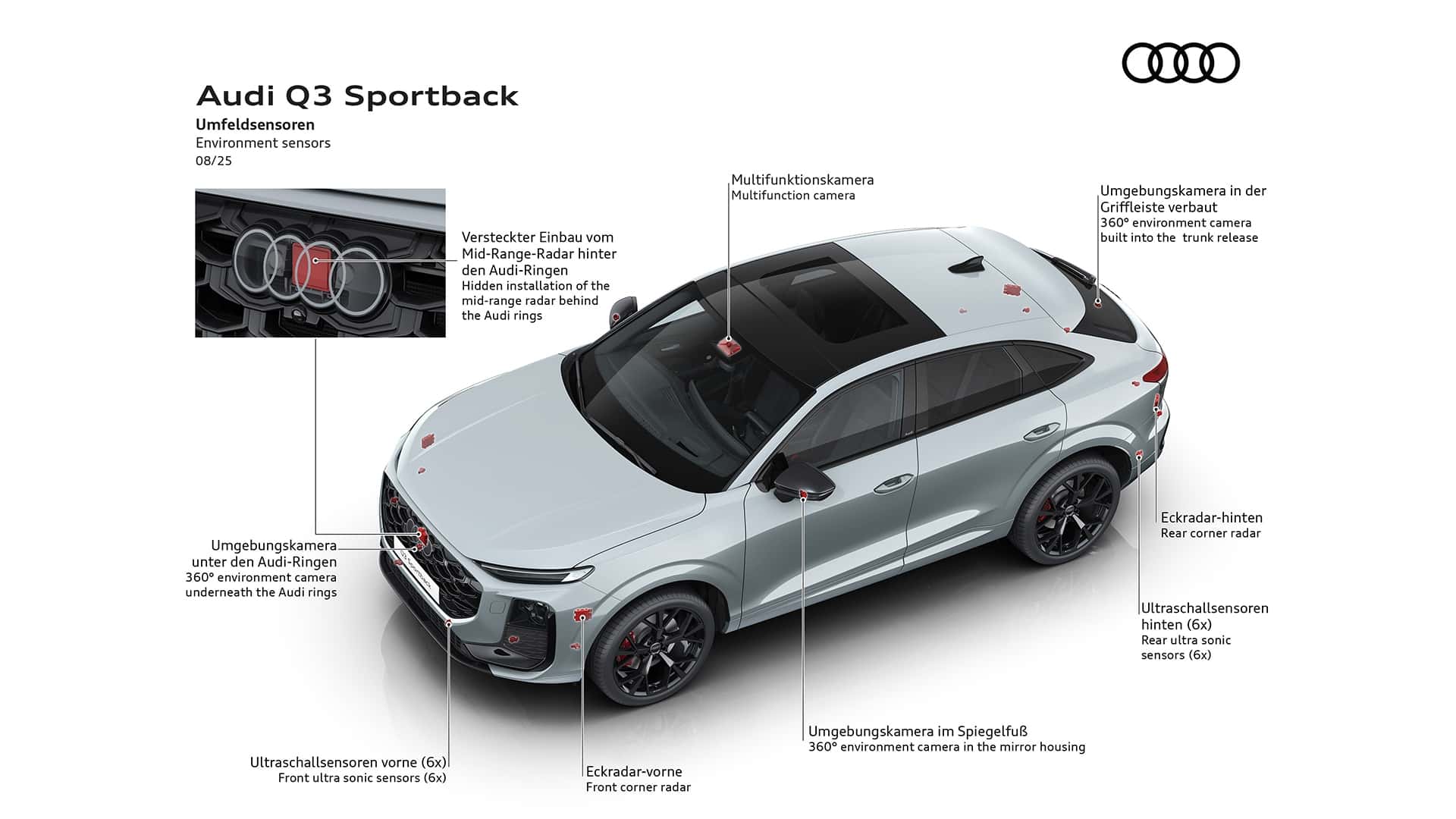 وفقًا لأودي ، يجمع الجيل الثاني من سيارتها بين "صفات سيارات الدفع الرباعي (سهولة الدخول، ورؤية شاملة، ومساحة عملية) وشكل الكوبيه". ينحدر خط السقف من العمود A، وهو أقل ارتفاعًا بمقدار 29 مليمترًا من سقف Q3، مما يُضفي على تصميمها مظهرًا رياضيًا، ويعود الفضل في ذلك جزئيًا إلى أقسامها الأكثر بروزًا.