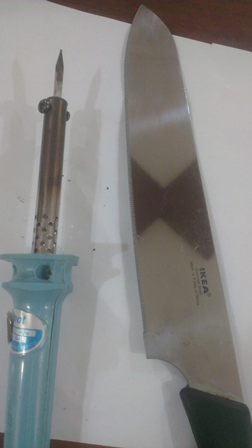 هذي عدة القطع (كاوية وسكين - طبعا فيه عدة أكثر إحترافية للقطع غير موجودة لدي-