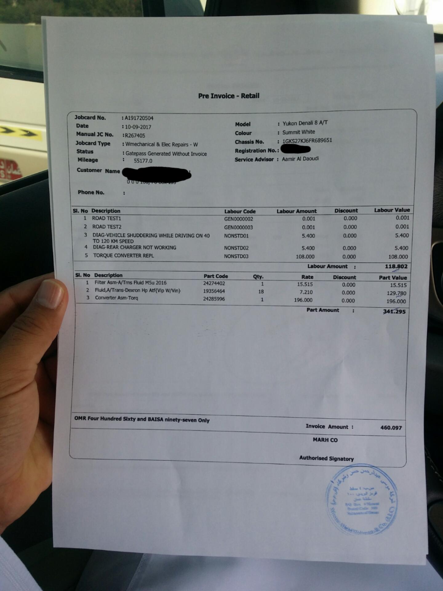 4- السيارة تهتز/تنتفض ع سرعة 80/10/120 كم والسبب قطعة بين المكينة والجير يسمى (converter) بتاريخ 12/9/2017 كم 55177 وتم التغير خلال 17 يوم (ع كلامهم إن زيت الجير ما يتغير أبدا علشان كذية تأخرنا) بصراحه اللي أعرفه إن كل زيت له عمر أفتراضي.