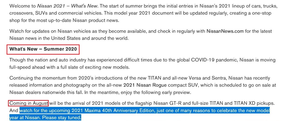 ثانياً: في عام 2018 وخلال الكشف عن الجيل الجديد من نيسان ألتيما صرح مسؤول تخطيط المنتج السابق في نيسان امريكا الشمالية ان الشركة تعمل على تطوير الجيل المقبل من نيسان ماكسيما وانها ستكون اعلى من التوقعات وقد استخدم بعض الاوصاف التي قمت بمطابقتها ببعض البيانات والتصورات التي جمعتها وخلصت الى نتيجة حول ماهية الماكسيما المقبلة