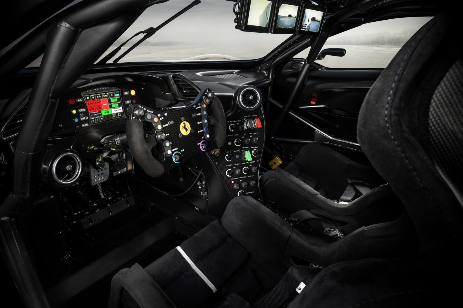 وداخل المقصورة ، تعد KC23 سيارة سباق حقيقية ، حيث تحتفظ بأكبر قدر ممكن من الجزء الداخلي لسيارة 488 GT3 Evo. والتعديلات الوحيدة هي على لوحة الباب ولمسات لوحة القيادة على جانب الراكب. وتحتوي المقاعد الخاصة بالطراز على تعديل كهربائي وشعار في فرش ألكانتارا فوق إطار من ألياف الكربون . كما تأتي مع دعم جانبي ليس فقط عند الوركين ولكن الكتفين والرأس أيضًا. وأمام السائق عجلة قيادة سباقية شبه مربعة وأدوات تحكم كاملة.