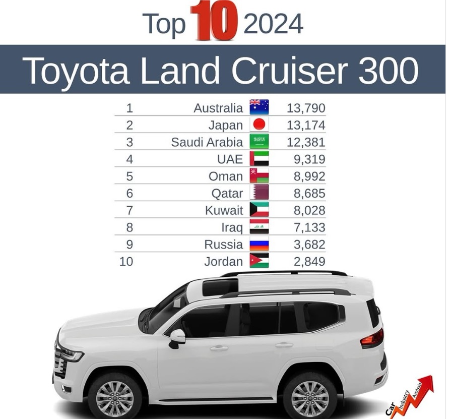 ووفقًا لبيانات جمعها فيليبي مونوز من كاريندستري أناليسيس ، باعت تويوتا 105,700 وحدة من سلسلة لاند كروزر 300 العام الماضي. ويمثل هذا الرقم انخفاضًا طفيفًا بنسبة 2% مقارنةً بعام 2023. وتصدرت أستراليا السوق بمبيعات بلغت 13,790 وحدة، متقدمةً بفارق ضئيل على اليابان التي جاءت في المرتبة الثانية بمبيعات بلغت 13,174 وحدة.