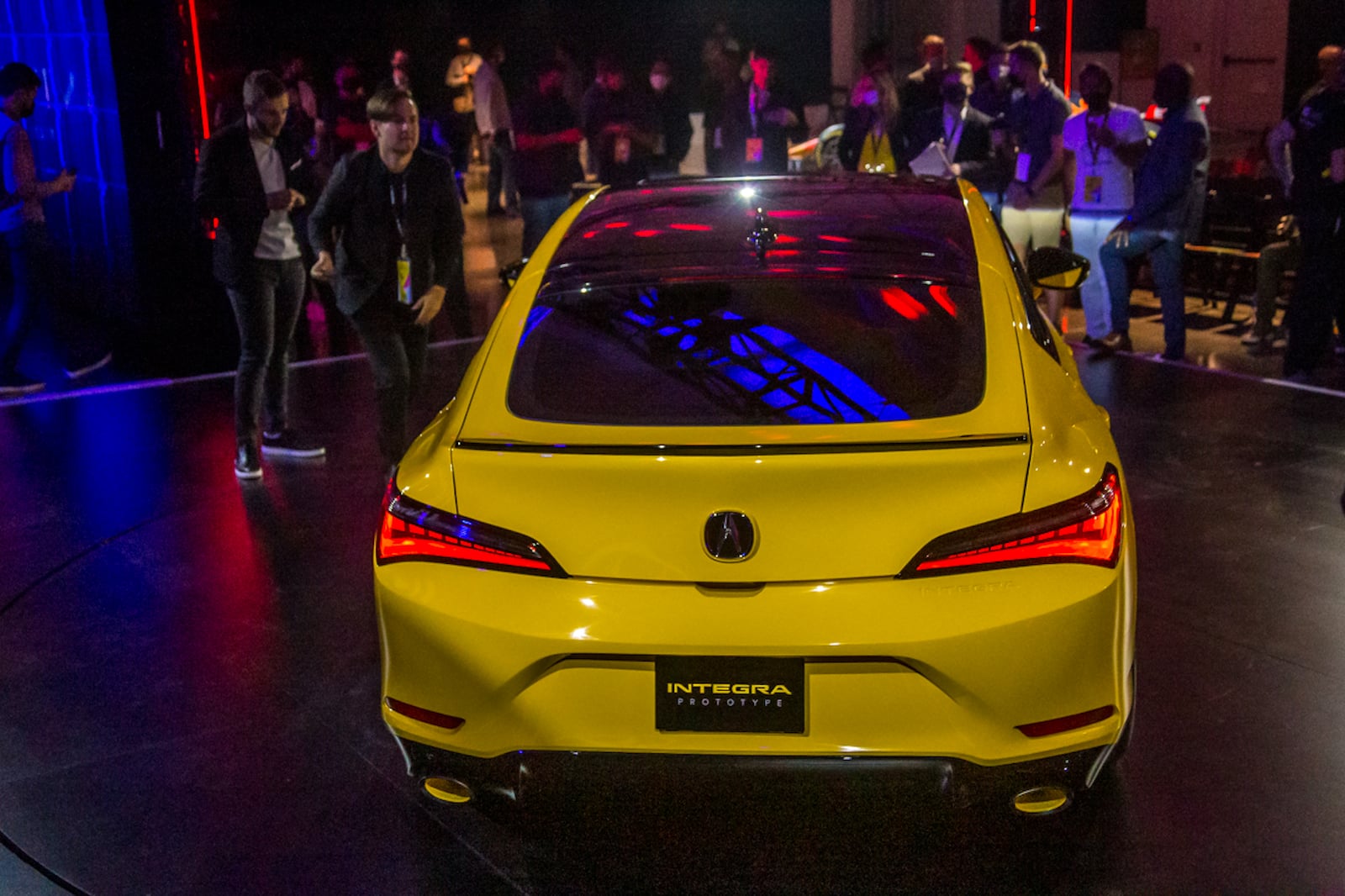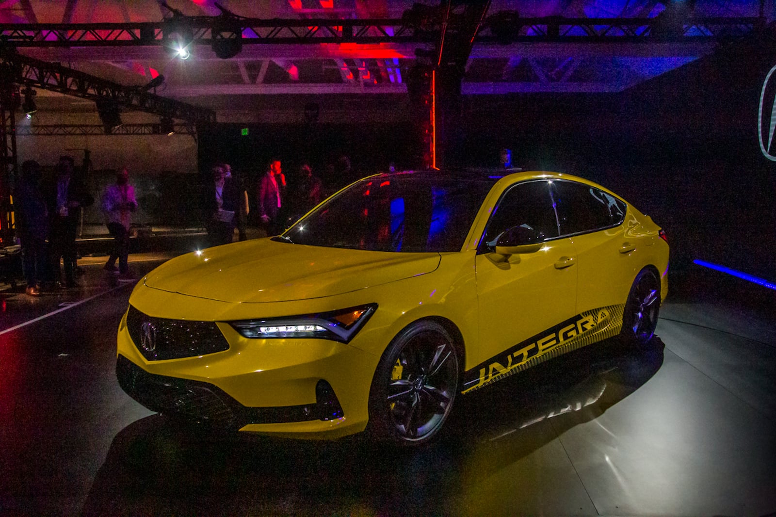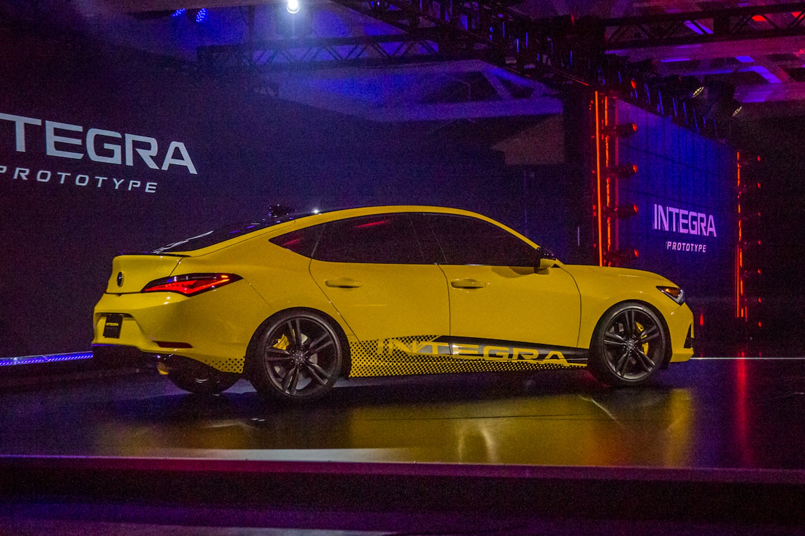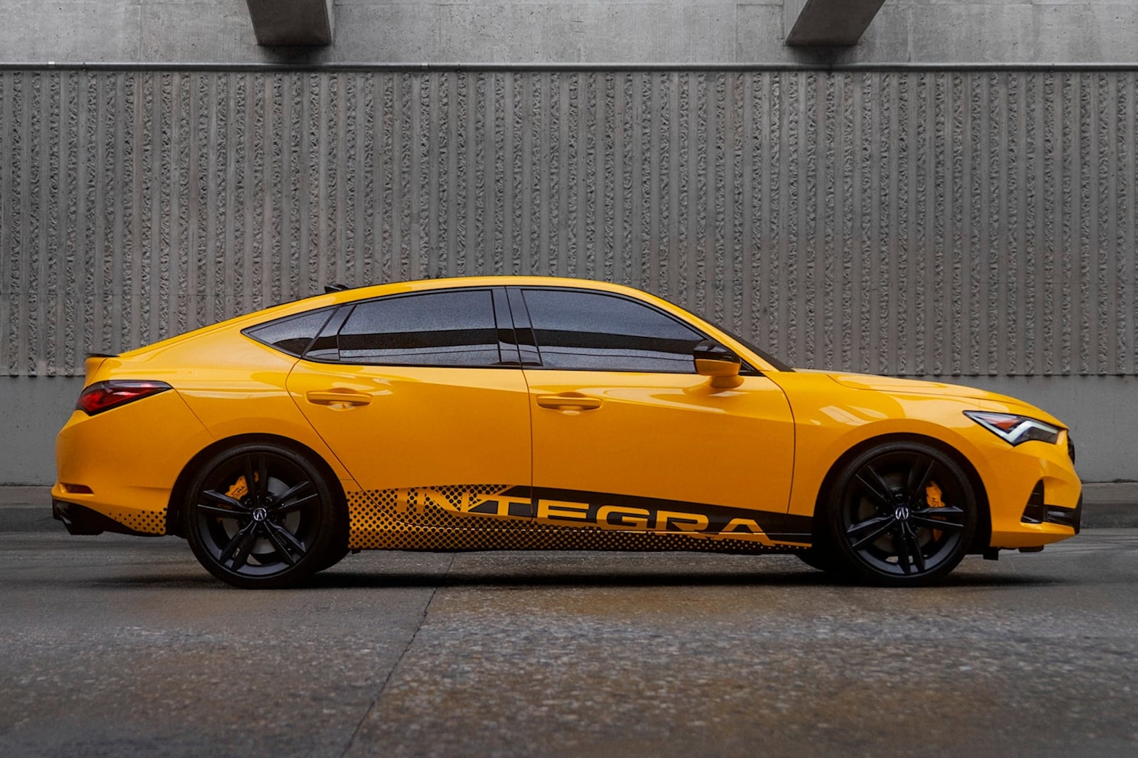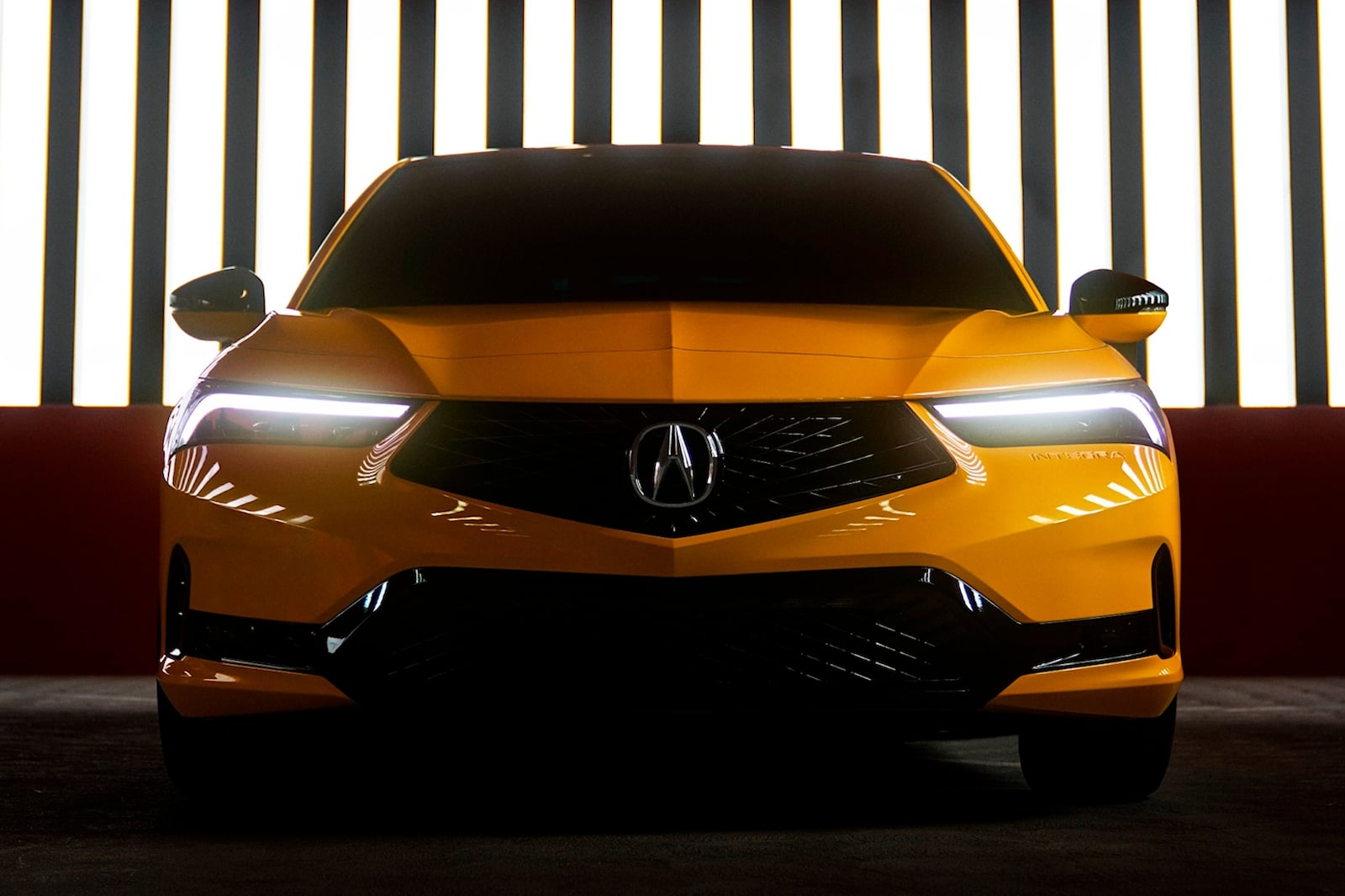 ومع خط السقف الذي يشبه الكوبيه وتصميم السيارة بخمسة أبواب ، يبدو طراز انتجرا الأولي بالطلاء الأصفر اللؤلؤي اندي كما لو كان مستعار من طرازات هوندا NSX. كما يوجد اسم انتجرا منقوش تحت المصباح الجانبي الأمامي جهة السائق والمصابيح الخلفية جهة الراكب. و تشمل إشارات التصميم الرائعة الأخرى شبكة أكيورا الماسية السداسية بدون إطار. وعلى كل جانب توجد مصابيح LED نهارية تقع فوق المصابيح الأمامية JewelEye LED. وفي الخلف توجد أقواس عجلات عضلية مع مخرجي عادم. وتتميز المصابيح الخلفية العريضة المكونة من قطعة واحدة بتصميم فريد.