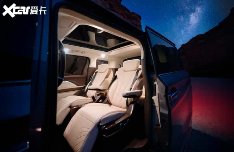 ويمكن للركاب الدخول والخروج من السيارة عبر أبواب منزلقة. كما تأتي بسبعة مقاعد بتصميم 2 + 2 + 3 عبر ثلاثة صفوف من المقاعد المغطاة بالجلد. وتحتوي مقاعد الصف الثاني على دعامة لأسفل الظهر بأربعة اتجاهات ، ومسند للساق ومسند ظهر قابل للتعديل كهربائيًا ، وتهوية ، وتدفئة ، وتدليك. ويمكن طي المقاعد ذات الثلاثة صفوف لأسفل لتوفير مساحة أكبر لصندوق الأمتعة.
