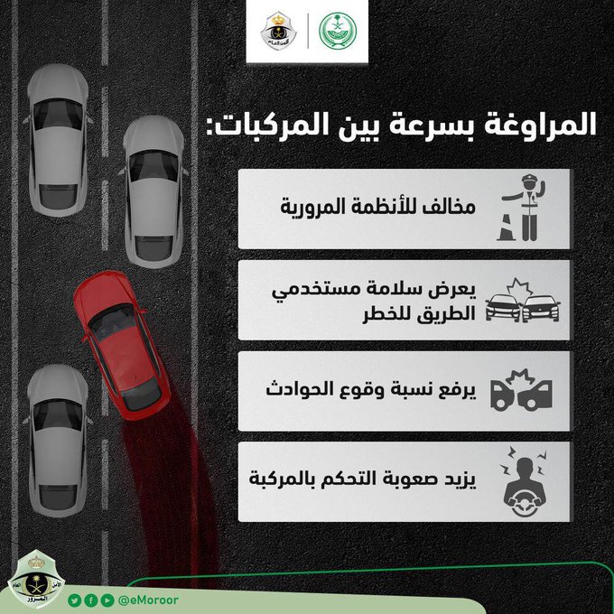 السيارات – طالب المرور السعودي سائقي السيارات الخاصة والمركبات بصورة عامة بضرورة الابتعاد عن المراوغة بسرعة بين المركبات والالتزام بتنظيمات السير على الطرق، وأكد أن المراوغة بين المركبات بسرعة لها آثار سلبية تشمل :