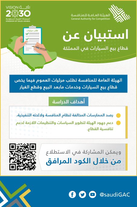 السيارات – أعلنت الهيئة العامة للمنافسة في المملكة العربية السعودية عن دعوتها المواطنين للمشاركة في استبيان حول دراسة هيكل قطاع بيع السيارات وخدمات ما بعد البيع وقطع غيار السيارات. ووضحت أن أهداف الدراسة تشمل رصد الممارسات المخالفة لنظام المنافسة ولائحته التنفيذية .