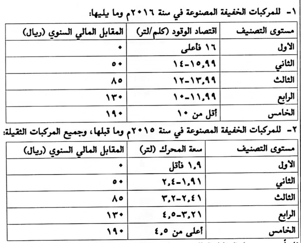 التصنيف 5 في اقتصاد الوقود : أقل من 10 كم لكل لتر : المقابل المالي في العام يساوي 190 ريال.