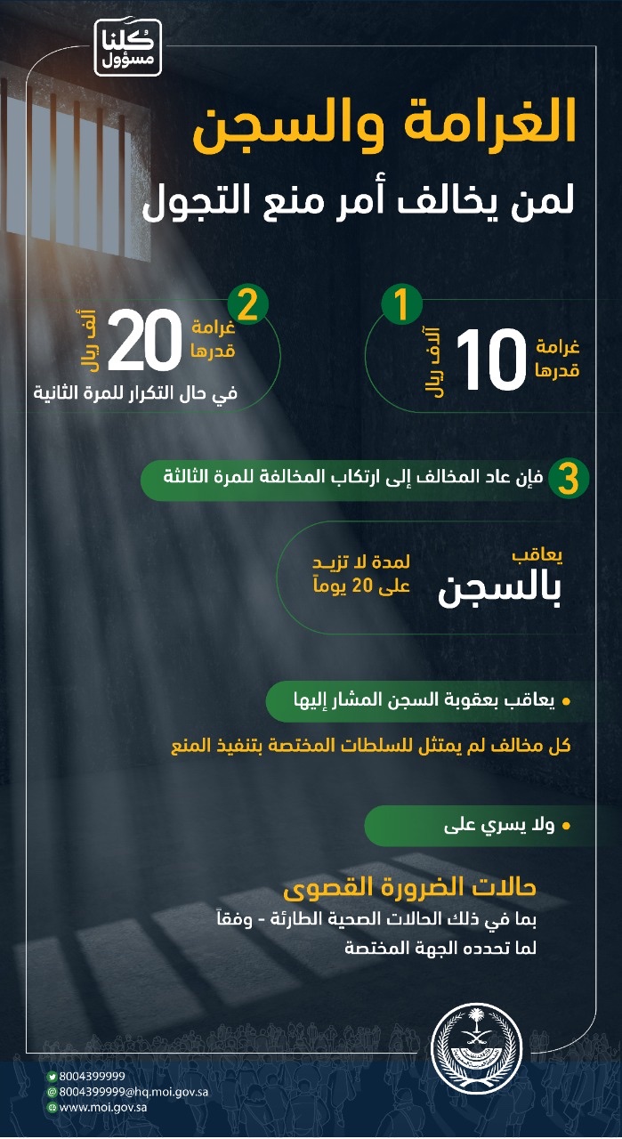ويعاقب بالسجن 20 يوم كل مخالف لم يمتثل الي السلطات المختصة بتنفيذ المنع ولا يسري الأمر على حالات الضرورة القصوى بما في ذلك الحالات الصحية الطارئة وفقاً لما تحدد الجهات المختصة. ويذكر أن حظر التجول في السعودية يمتد من الساعة السابعة مساءً وحتى الساعة السادسة صباحاً لمدة 21 يوم بداية من الاثنين الماضي.