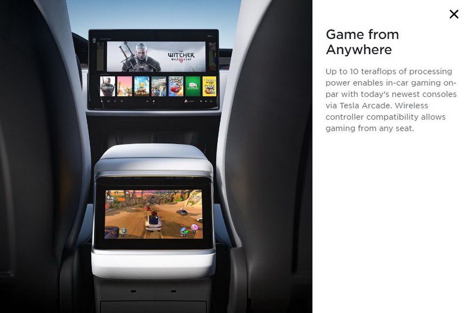 وقالت تيسلا أيضًا أن الشاشتين المركزيتين الجديدتين للطرازات S و Model X المحدثين يتميزان بجهاز كمبيوتر ألعاب يتمتع بقدرة معالجة كبيرة ، وهو ما يماثل تقريبًا وحدات تحكم الألعاب من الجيل الأحدث ، مما يتيح لهم تشغيل الألعاب مثل “The Witcher 3” و “Cyberpunk” بالإضافة إلى ألعاب الآركيد .