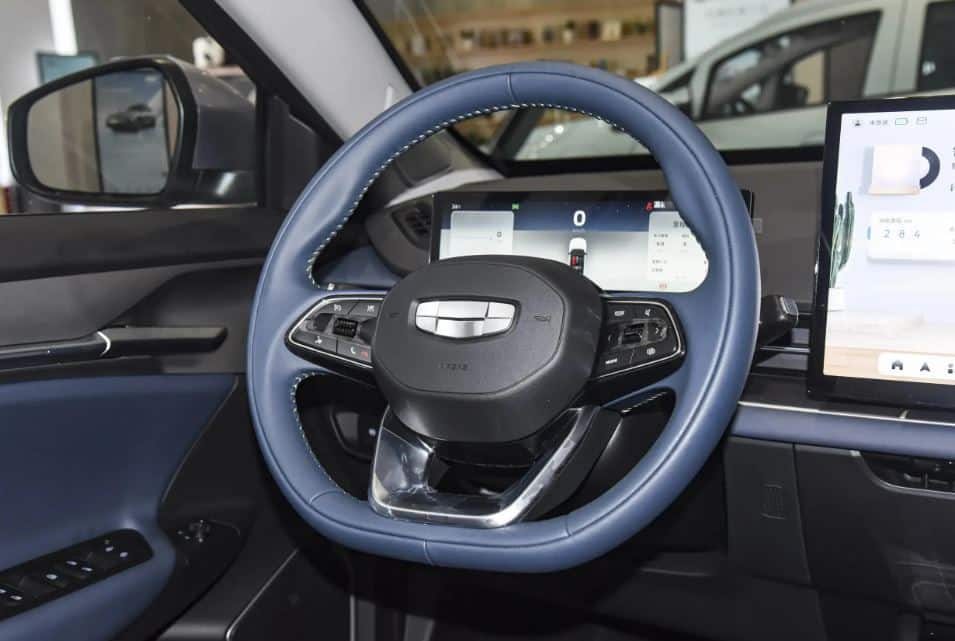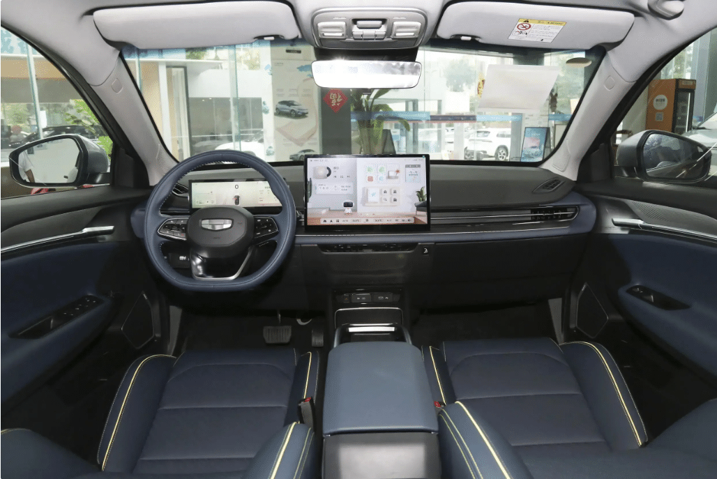 وفي الداخل، تدعي جيلي أن مقصورة القيادة مغطاة بمساحة كبيرة من مواد ناعمة. ومن الواضح أن هناك عجلة قيادة مسطحة ذات ثلاثة أذرع، ولوحة عدادات LCD مستطيلة رفيعة مقاس 10.2 بوصة. كما تتوفر شاشة تحكم مركزية مقاس 14.6 بوصة أو شاشة تحكم مركزية مقاس 10.2 بوصة للطرازات الأقل. ويأتي نظام التشغيل داخل السيارة كنظام HarmonyOS من هواوي، والذي يدعم التفاعل/التعرف الصوتي استنادًا إلى نموذج الذكاء الاصطناعي والمشاركة عبر الشاشات وتحديثات OTA ونقاط اتصال Wi-Fi.