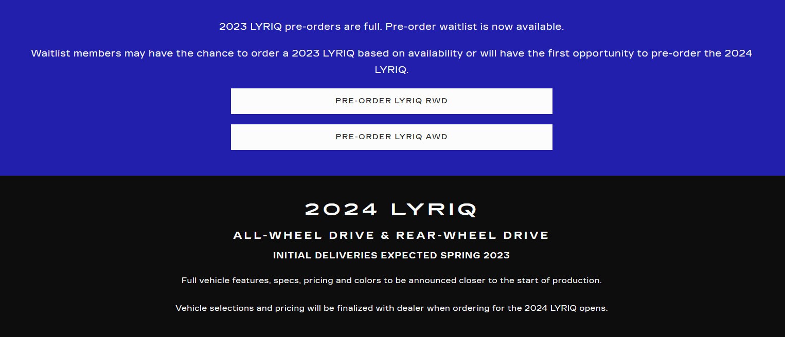 وهذا يعني أنه من المحتمل أن يحصلوا على نسخة من السيارة في حال تراجع عميل آخر عن الاستلام . ولكن ، إذا لم يكن الأمر كذلك ، فسينقلون لحجز طراز 2024 . وقالت كاديلاك إنه من المتوقع أن تبدأ عمليات التسليم الأولية لموديلات 2024 في ربيع عام 2023. ومع ذلك ، سيتم الإعلان عن “ميزات السيارة الكاملة ، المواصفات ، الأسعار والألوان” مع اقتراب بداية الإنتاج.
