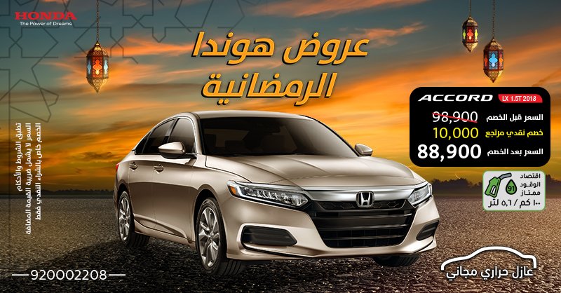 السيارات – أعلنت شركة عبدالله هاشم وكيل سيارات هوندا في السعودية عن عروض خاصة على سياراتها في خلال شهر رمضان المبارك في المملكة وشملت العروض موديلات هوندا سيفيك وهوندا أكورد وجاءت العروض كالتالي: