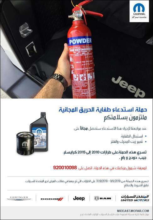 السيارات – أعلنت الشركة المتحدة للسيارات وكيل علامات رام وجيب ودودج عن حملة لاستدعاء بعض الطرازات تشمل استدعاء طفاية الحريق وتبديل الزيت المجاني. وقالت الشركة أن حملة استدعاء طفاية الحريق تعتبر مجانية لالتزام الشركة بسلامة السائقين والركاب ، وقالت أن من سيحضر للاستدعاء سيحصل مجاناً على :