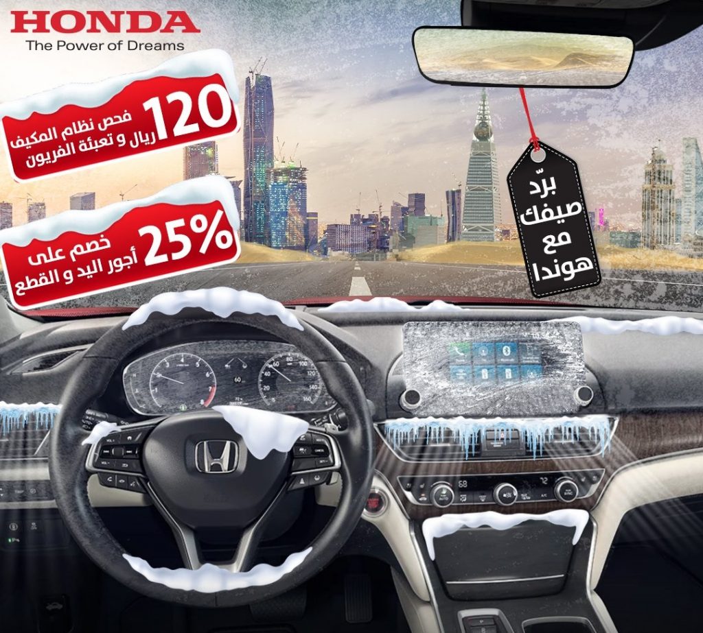 السيارات – أعلنت شركة عبدالله هاشم المحدودة وكيل سيارات هوندا في المملكة العربية السعودية عن عروض جديدة . وجاء العرض تحت شعار صيفك ثلج مع هوندا. وقالت الشركة أن العرض يشمل فحص مكيف السيارة بأسعار مخفضة والحصول على خصومات خاصة .