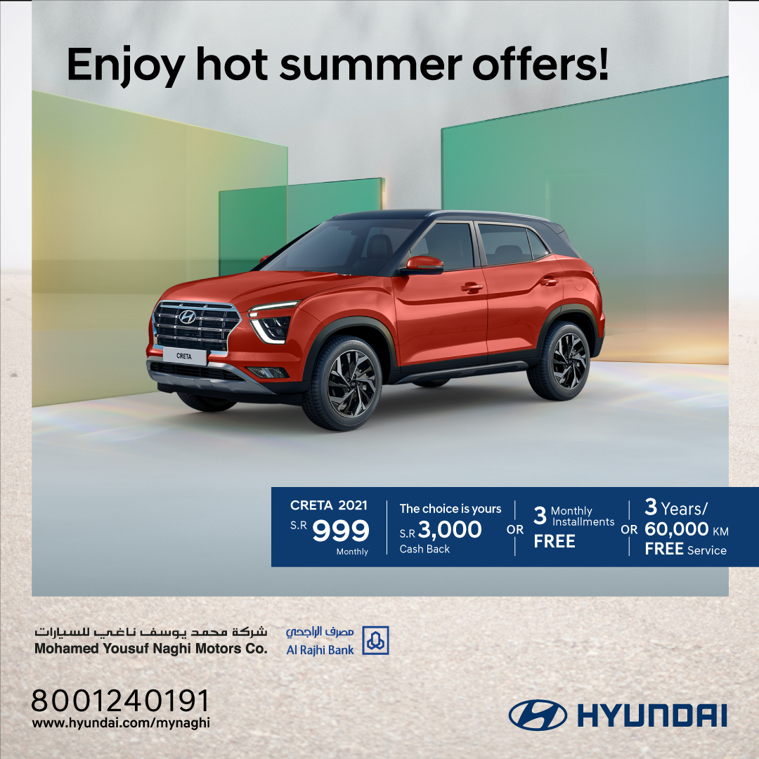 كما يضم كريتا 2021 بقسط شهري 999 ريال شهرياً مع 3 اقساط شهرية مجانا أو 3,000 ريال خصم من قيمة السيارة أو 3 سنوات / 60,000 كم صيانة مجانية .