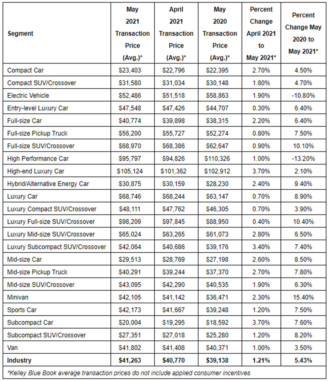 وعلى مستوى كلي ، يبلغ متوسط سعر المركبات الخفيفة الجديدة 41.263 دولارًا أمريكيًا مقارنة بـ 39138 دولارًا أمريكيًا في مايو 2020. كما انخفض متوسط سعر السيارة الكهربائية جديدة بنسبة 10.8% ، بينما انخفض متوسط سعر السيارات عالية الأداء بنسبة 13.2%. كما ارتفعت أسعار سيارات الميني فان أكثر من غيرها ، حيث ارتفعت بنسبة 15.4 في المائة مقارنة بشهر مايو 2020.