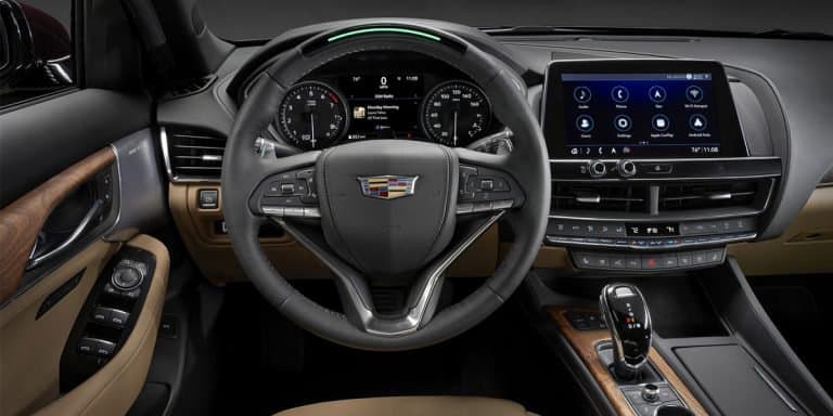 أما في الداخل ، فلم تكن كابينة CTS تمثل قمة معايير السيارات الفاخرة ، ولكن يجب أن يكون التصميم الداخلي لسيارة CT5 أفضل حالًا حيث أنه يحتوي على مواد عالية الجودة وتصميم مُحسّن مع نظام المعلومات والترفيه 10 بوصة أعلى لوحة القيادة بما يسهل النظر إليه. ولسوء الحظ ، تم استبدال مفاتيح CTS الأنيقة بأزرار مملة إلى حد ما.