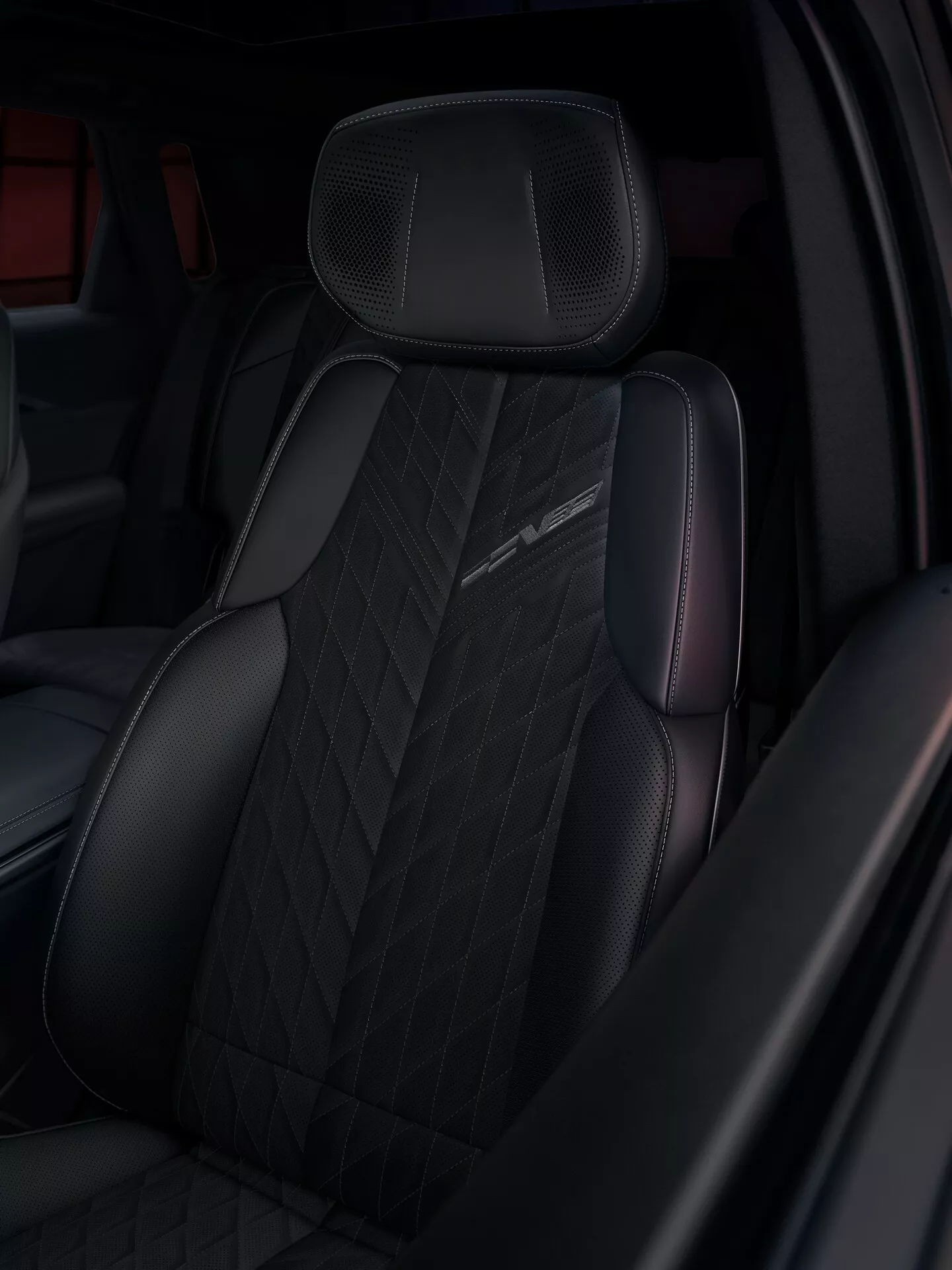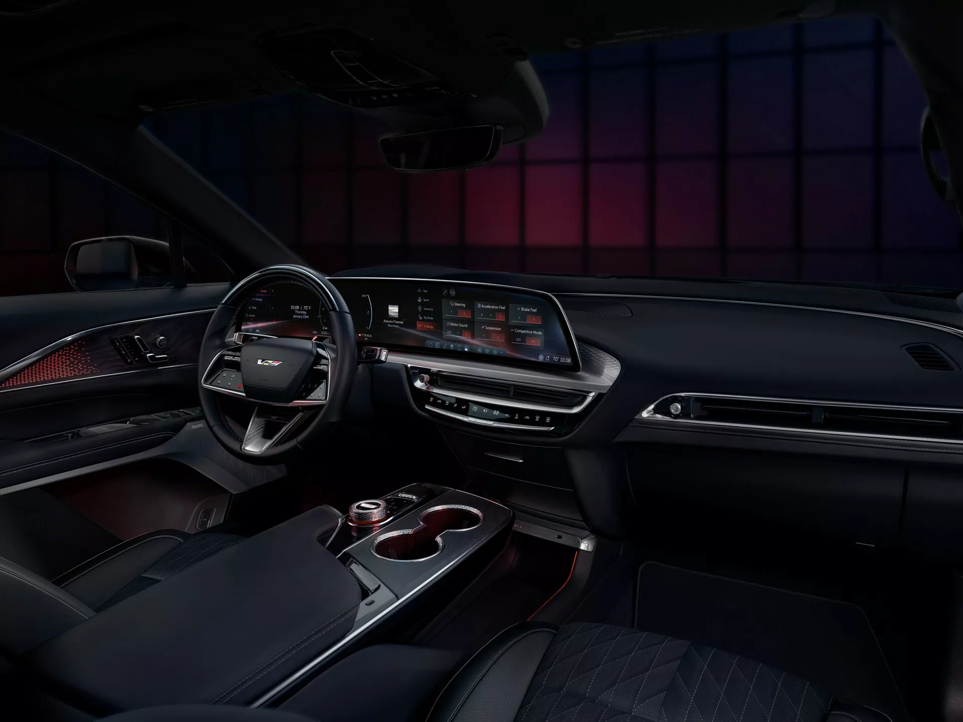 وتعد الشاشة مقاس 33 بوصة هي عامل الجذب الرئيسي وهي تتميز بتجربة معلوماتية ترفيهية “V-ified”. وسيجد المشترون أيضًا زخارف من الخشب الورقي وألواح عتبات أبواب V-Series المضيئة. وسيصبح الطراز أيضًا أول سيارة كاديلاك تحتوي على شاشة عرض أمامية مزدوجة المستوى للواقع المعزز. وتكتمل أبرز الميزات بسقف زجاجي بانورامي ثابت، وSuper Cruise، ونظام صوتي AKG مكون من 23 مكبر صوت.