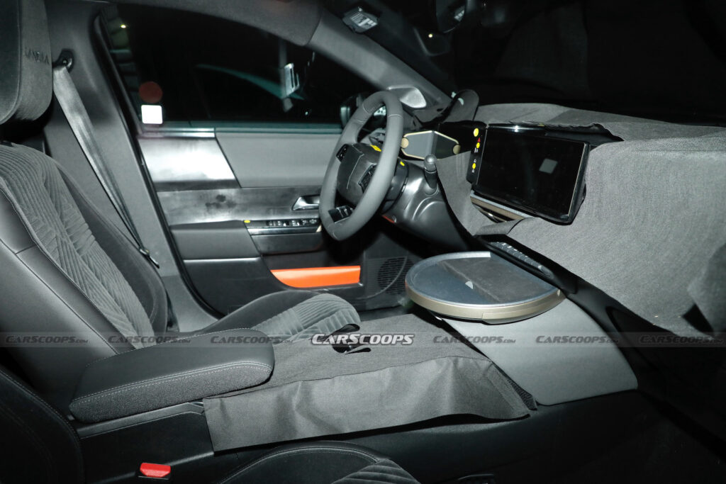 ولكن داخل المقصورة، سوف تقوم السيارة بتقديم مزايا فاخرة. وتشمل مقاعد مغطاة بمزيج من الجلد والقطيفة، ومساند الرأس بما يشبه القطيفة ويعرض اسم “Lancia” عليها. ولكن أغرب ما في المقصورة الداخلية هو اللوحة الدائرية المثبتة أسفل شاشة اللمس الخاصة بنظام المعلومات والترفيه. ويبدو أنها تحتوي على لوحة شحن للهاتف اللاسلكي .