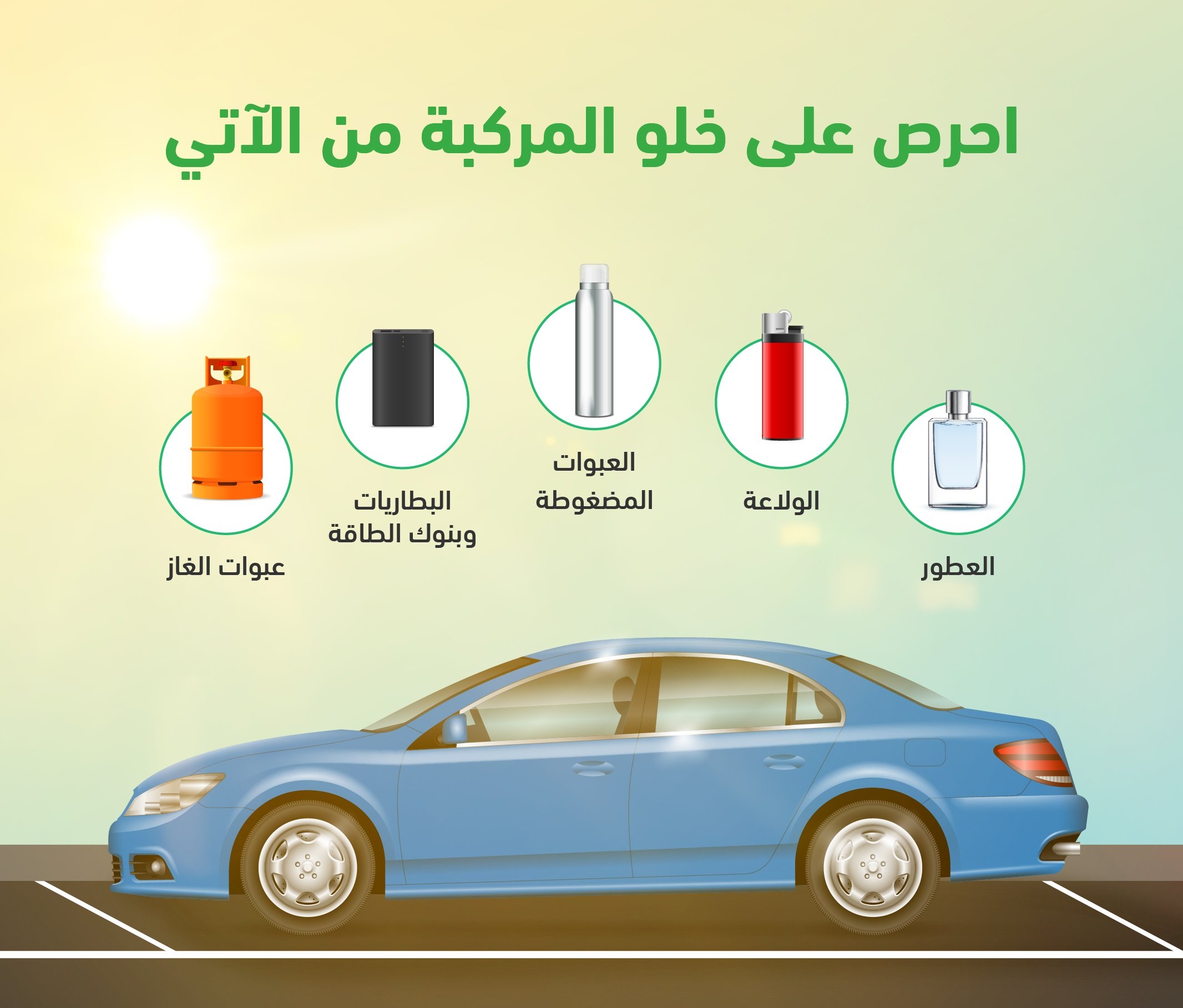 ومن جانب آخر قال المرور أنه مع ارتفاع درجات الحرارة في خلال فصل الصيف, فيجب التأكد من خلو المركبة من المواد القابلة للتفاعل مع الحرارة تفادياً لوقوع الحرائق. وتشمل هذه المواد :