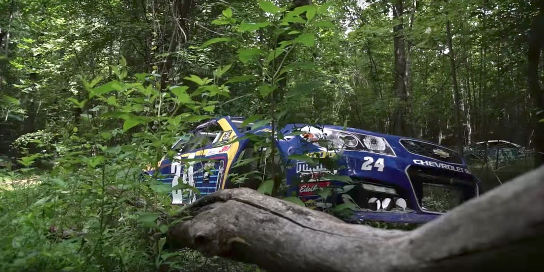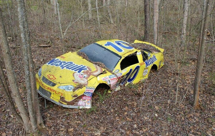 تتواجد بعض سيارات سباقات ناسكار المهجورة على بعد مسافات كبيرة للغاية من المضمار، وهو ما نراه مع هذه السيارة هنا التي تحمل علامة شيفروليه مدفونة بالغابة و محاطة من كل الاتجاهات بأوراق الشجر الكثيفة والأشجار والحطام، حيث قد يصعب تخيل أن هذه السيارة كانت في يوم ما تسير على الحلبات بسرعات تبلغ 320 كم/س.