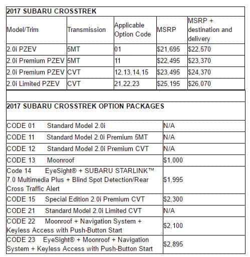 السيارات – كشفت سوبارو عن أسعار موديل XV Crosstrek الذي يصنف كموديل 2017 للسوق الأمريكي ، فيما ستصل السيارة للموزعين في الولايات المتحدة في نوفمبر المقبل. وسيبلغ سعر النسخة القياسية من السيارة Crosstrek 2.0i قرابة 21.696 دولار وستحمل محرك بوكسر 2 لتر مع ناقل حركة مانيوال من 5 سرعات ، فيما سيولد المحرك قوة 148 حصان مع حصول السيارة علي خلوص أرضي بواقع 8.7 بوصة مع وصلة بلوتووث ونوافذ كهربائية وفرش خاصة للأرضية وعجلات ألومنيوم 17 بوصة.