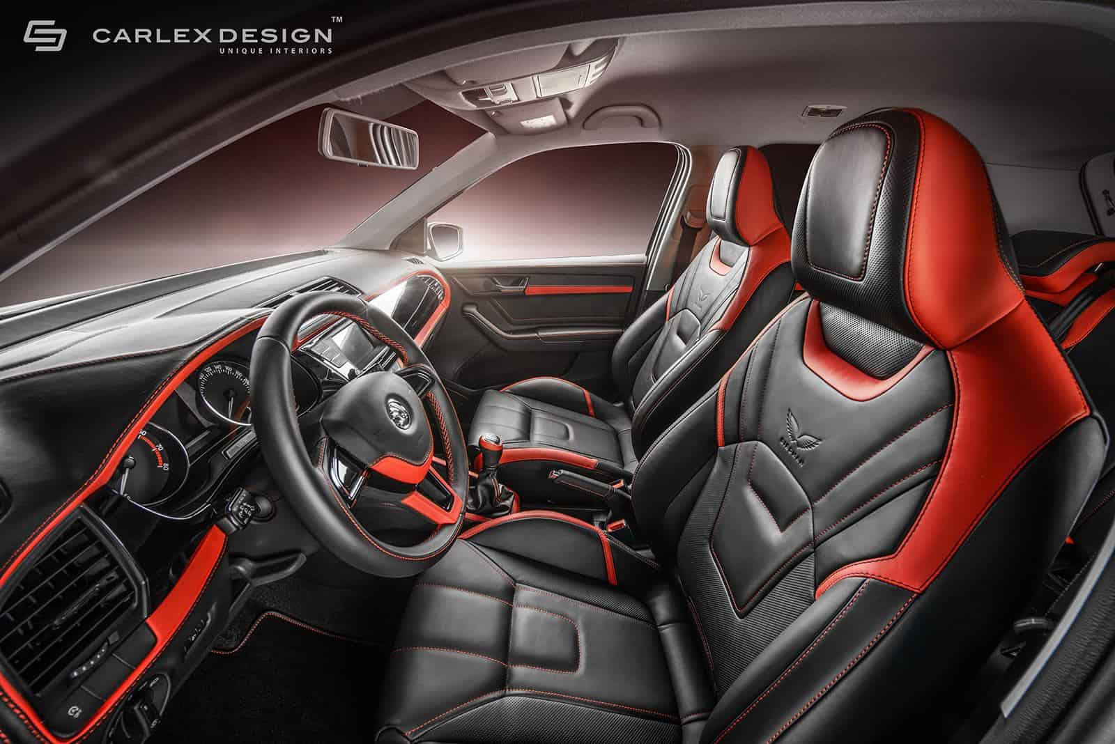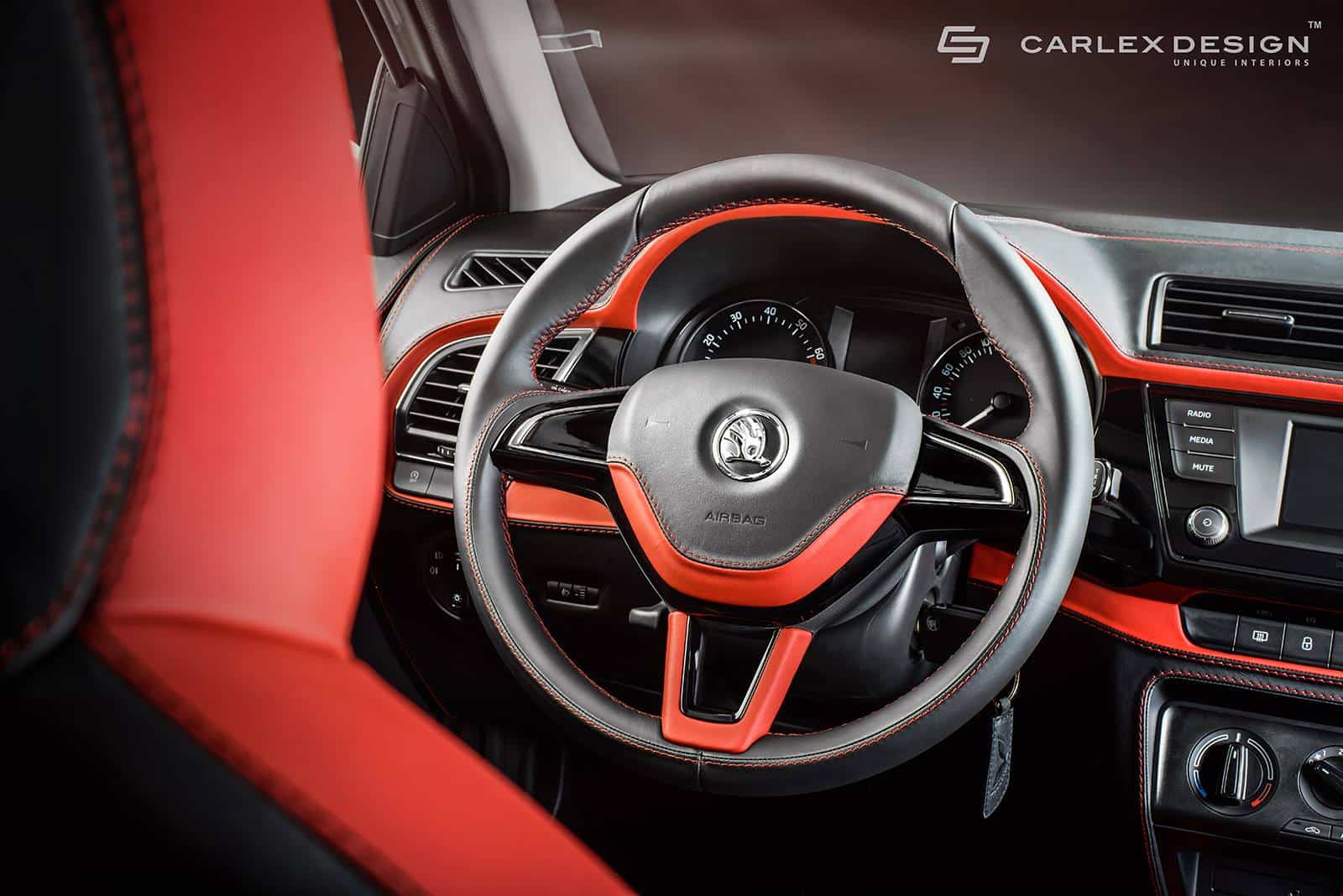 وهذه السيارة سكودا فابيا غير التقليدية، لا تقدم مقصورة بمميزات فاخرة ، ولكنها تأتي كما نري مريحة ومميزة في الشكل وأهم ما تحصلون عليه في هذه المقصورة عجلة قيادة جلدية فقط. وقامت Carlexبوضع فرش مميز علي كل جزء في مقصورة السيارة بنوعين من الجلود بداية من ذراع نقل الحركة نهاية بالتطعيمات علي عجلة القيادة . وتأتي السيارة ببراعة تستحق الإعجاب، وخاصة مع استخدام خياطة حمراء تظهر في أجزاء مختلفة من مقصورة السيارة.