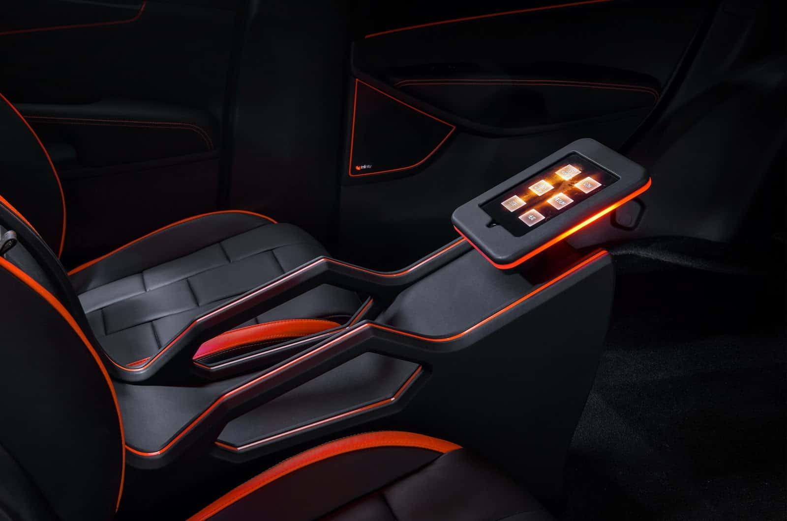 كما تشمل التعزيزات فرش جلدي رمادي وتطعيمات خشبية رمادية في الارضية مع طلاء أزرق خارجي PPG Lux لامع وشبكة تهوية علوية وسفلية معدلة واضاءة LED وعجلات خاصة 19 بوصة .