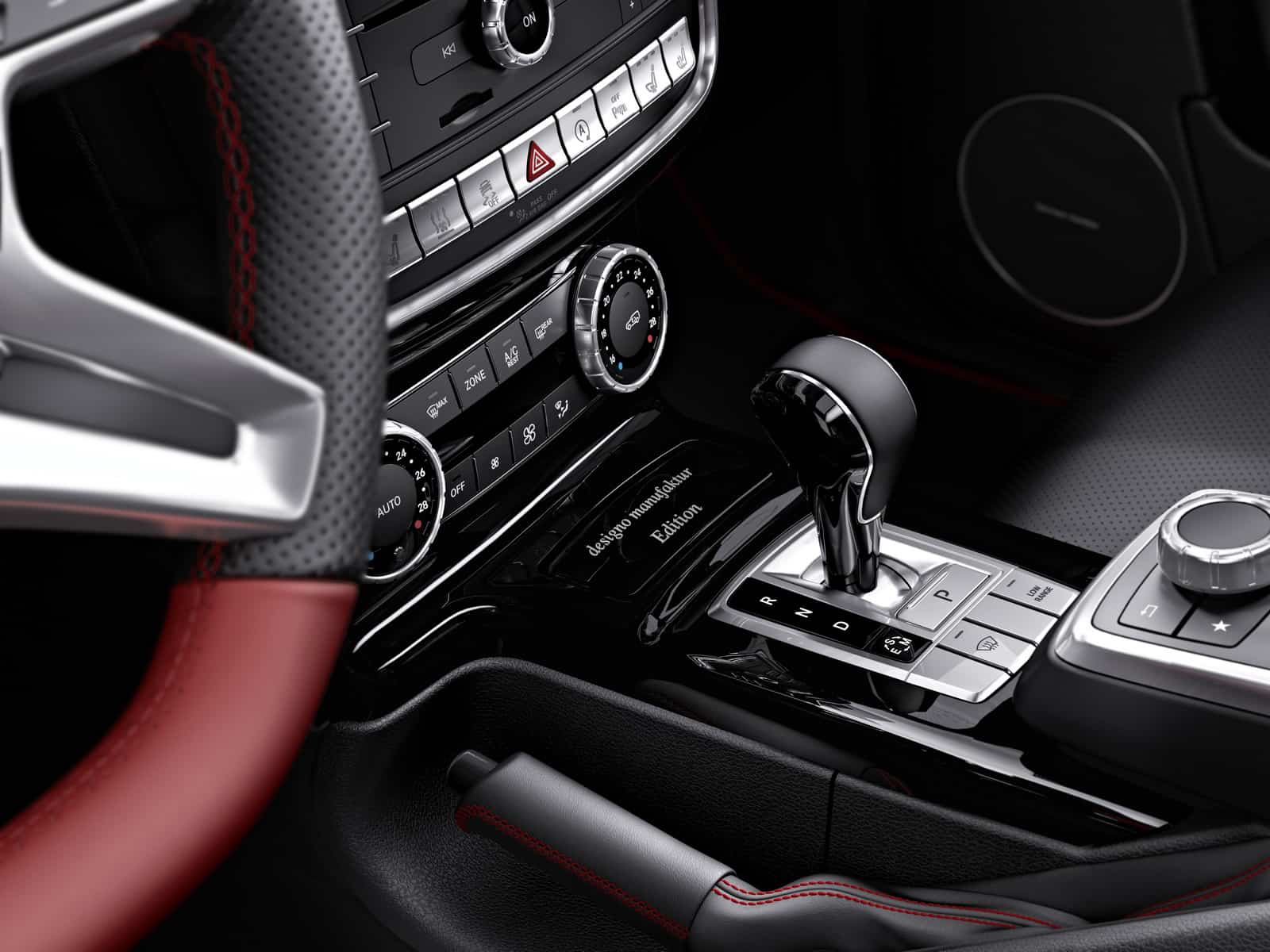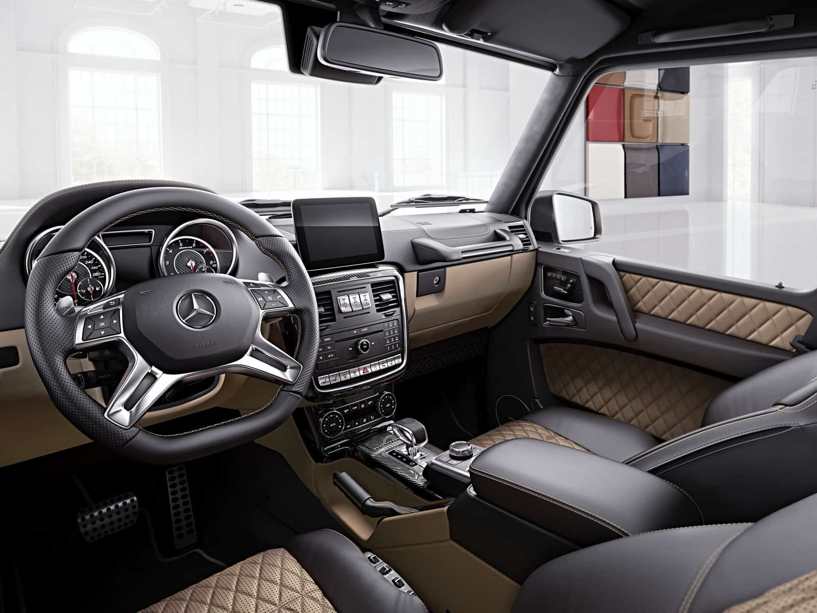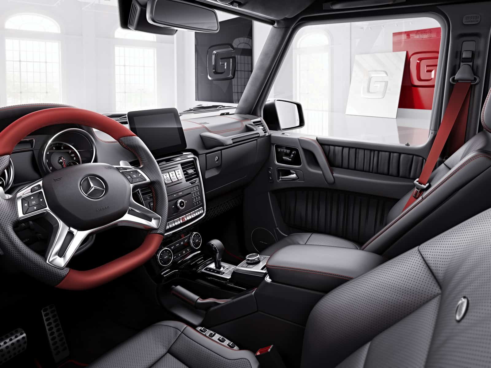 وفي المقصورة تحمل السيارة في نسخة designo manufaktur Edition G-Wagon الثانية فرش جلدي نابا وتطريز أحمر اللون وعجلة قيادة AMG ولمسات بيانو سوداء وأحزمة أمان حمراء اللون ولمسات جلدية سوداء في تبطين السقف وشعار designo manufaktur Edition الخاص علي الكونسول الوسطي وتضاف هذه التجهيزات لباقات اكسكلوسيف وسبورت وكروم التي تتوفر بصورة قياسية في كلا الموديلين.