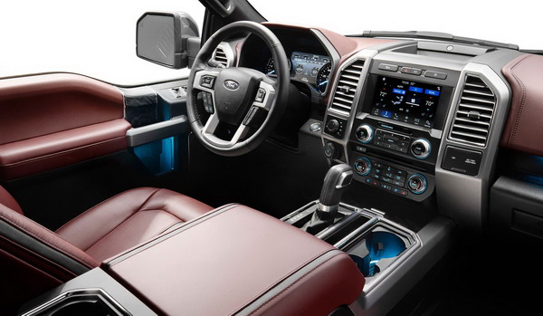 داخل المقصورة لازالت فورد F-150 تحتفظ بقوتها وهجوميتها، ولكن بمزيج من الفخامة والعصرية، وبخاصة مع التجهيزات الكثيرة التي تقدمها السيارة، والكسوة الجلدية الفاخرة على المقاعد ولوحة القيادة، وحتى النظام المعلوماتي المتوفر بخصائص عدة للتحكم في وظائف المقصورة والسيارة.