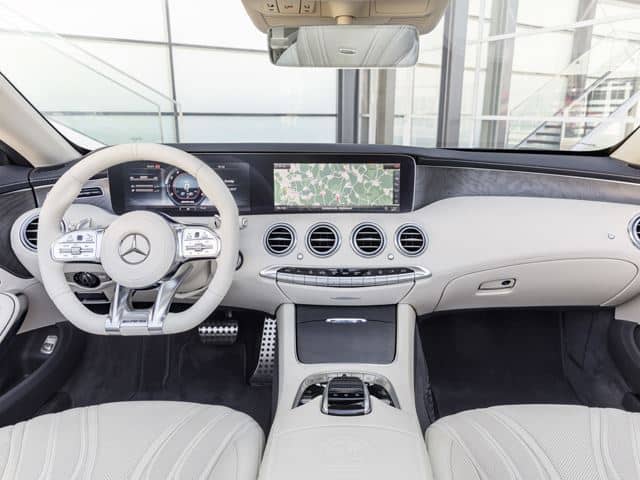 كما زودت بخطوط AMG سباقية في الجزء الأسفل الجانبي من السيارة الكوبيه عالية الأداء وفي الداخل توجد لمسات صفراء علي مقاعد AMG الرياضية وعجلة القيادة والعدادات وألواح الأبواب والكونسول الوسطي وفرش الأرضية, كما زودت المقصورة بلمسات بيانو خشبية سوداء وأخرى من ألياف الكربون المطفية وبصورة قياسية فالسيارة حصلت علي باقة Exclusive وتتميز بجلد نابا وتطريز خاص .