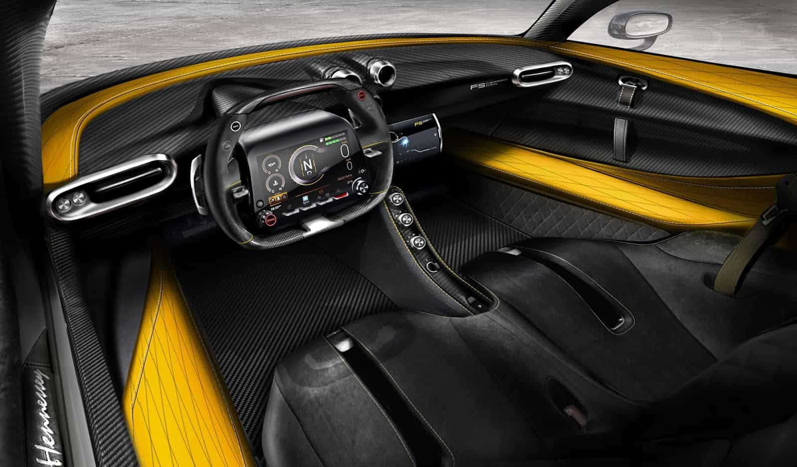 ومما لا يثير الدهشة، أن المقصورة ضيقة جدا وتتكون من مقعدين يبدو أنهما مثبتين على الأرض. كما تأتي فينوم F5 بنفق من ألياف الكربون لناقل الحركة الذي يمتد إلى شاشة كبيرة تعمل باللمس تضم نظام المعلومات والترفيه في السيارة. وفي مكان آخر، يمكننا أن نرى ثلاثة من فتحات الهواء مرتبة في شكل مماثل لمصابيح الذيل.