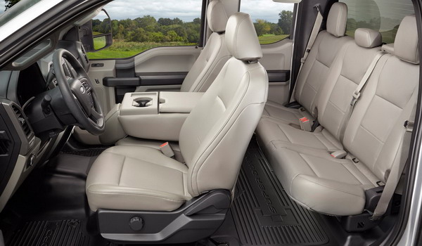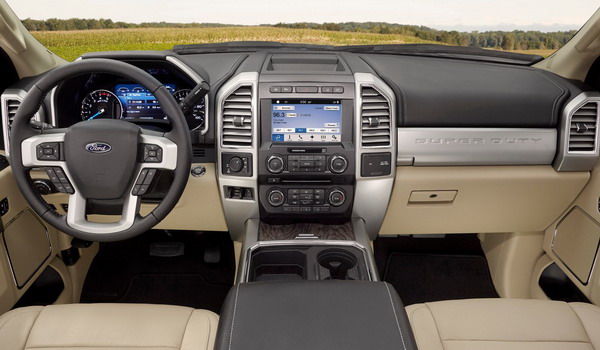تقدم فورد F-350 داخل المقصورة مستوى متميز من العملية والفخامة، بداية من لوحة القيادة المتطورة التي تضيء باللون الأزرق، مع شاشة معلوماتية في المنتصف، وعجلة القيادة كبيرة الحجم مع الكثير من أزرار التحكم للوصول إلى الكثير من وظائف المقصورة، وكذلك عصا نقل السرعات خلف عجلة القيادة.