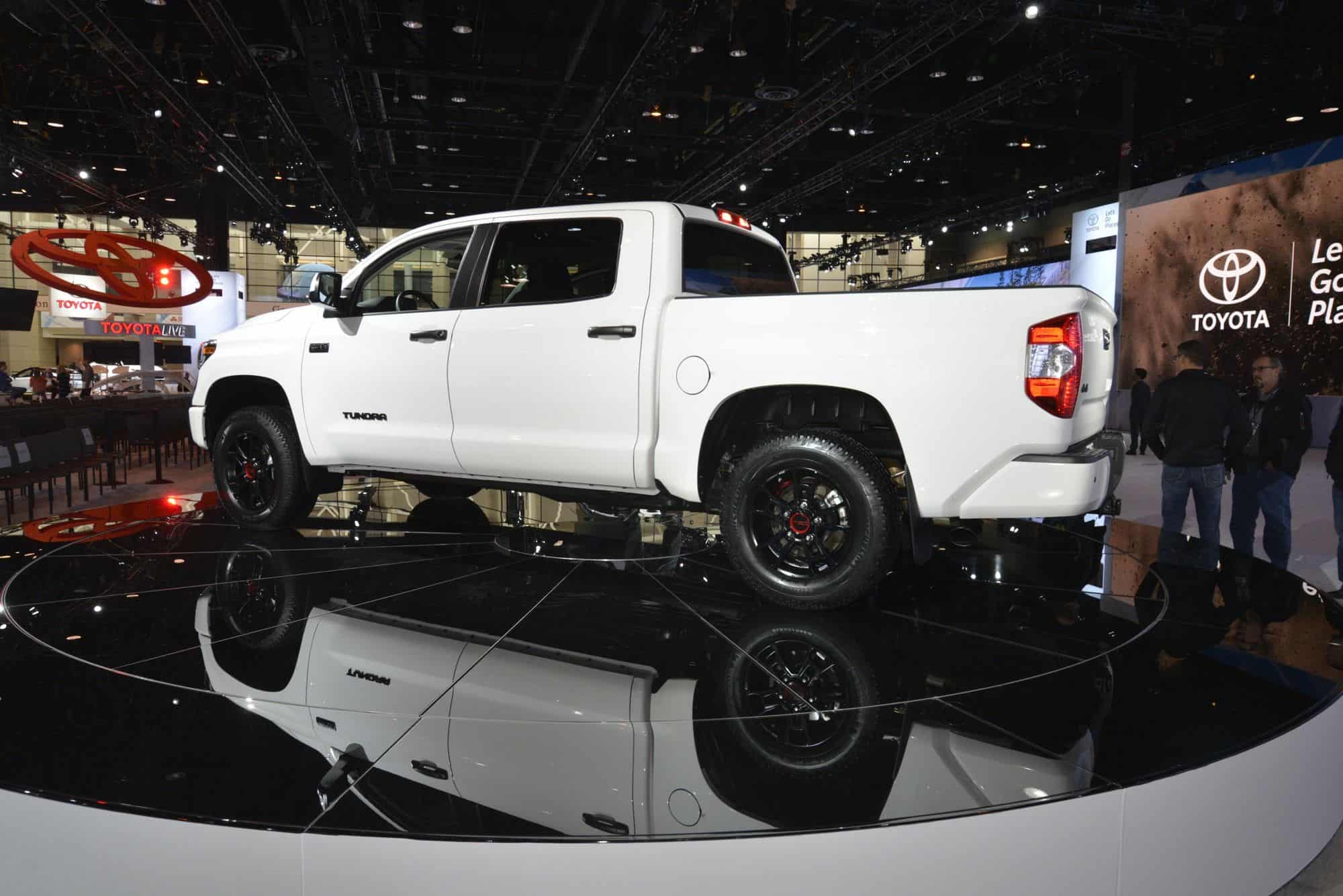 وفي البداية تأتي تندرا TRD Pro ممتصات الصدمات فوكس مع زيادة ارتفاع السيارة في الأمام والخلف أكثر من 2 بوصة كما تأتي تندرا بعجلات BBS 18 بوصة ألومنيوم خفيفة الوزن مع إطارات ميشلان P275/65R18 للتضاريس الوعرة وتشمل التعديلات مصابيح أمامية LED سوداء وشبكة تهوية جديدة سوداء وغطاء محرك معدل بفتحة تهوية ومصابيح ضباب LED Rigid Industries.