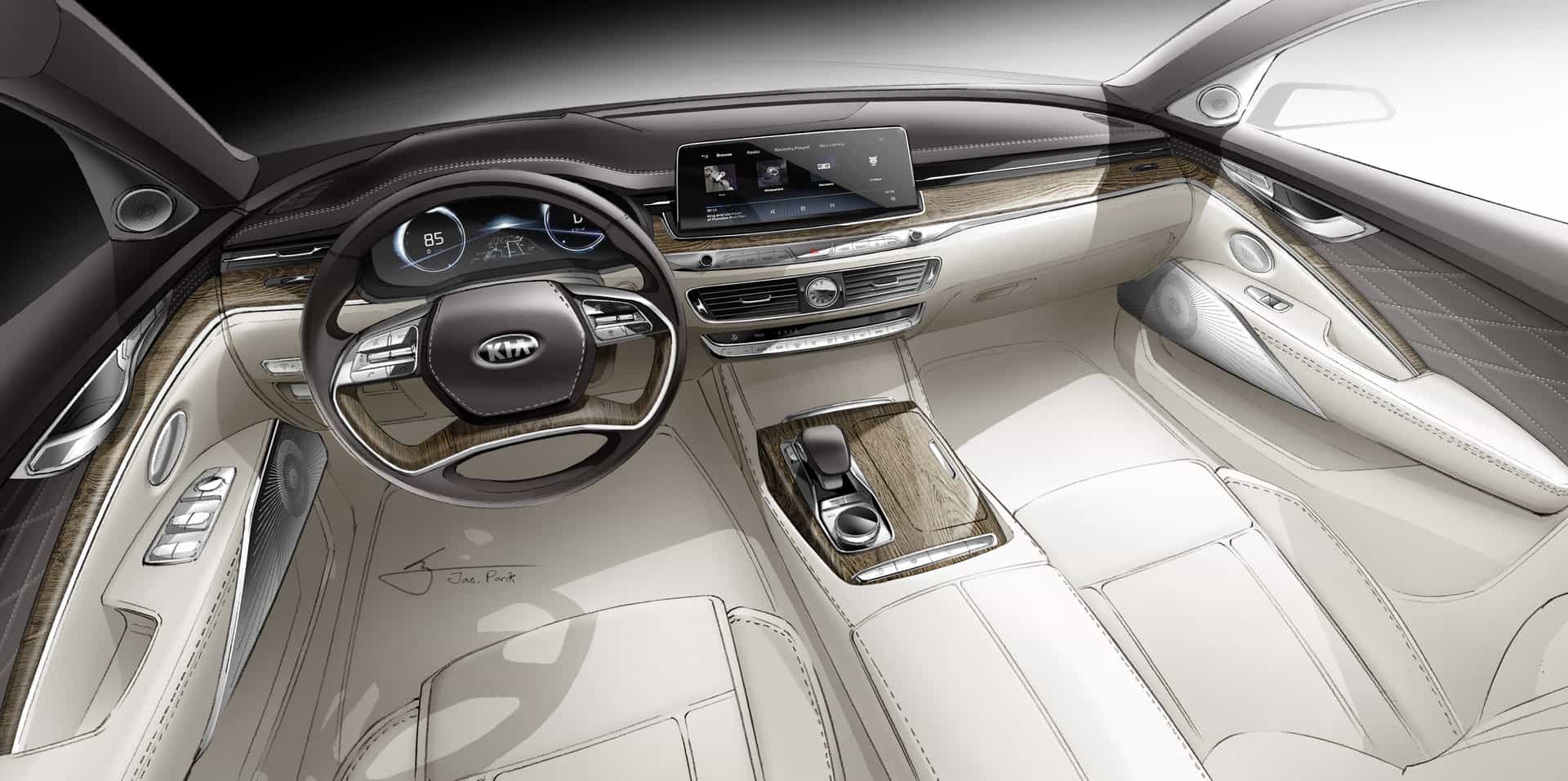 السيارات – تواصل كيا تقديم صور تشويقية للجيل الجديد من سيارتها K900 مع اسكتش يظهر المقصورة الداخلية للسيارة لأول مرة, وقد صممت السيارة بالتعاون بين مقر التصميم العالمي للشركة في كوريا واستديو التصميم في الولايات المتحدة بولاية كاليفورنيا وكما في الجزء الخارجي فالمقصورة الداخلية وصفت بأنها ذات ملامح مريحة وهادئة.