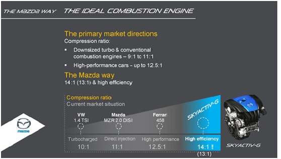 مازدا في محركها الجديد اتخذت نهج رفع نسبة الانضغاط لتصل الى اعلى نسبة انضغاط مسجله في محرك تجاري في العالم 14:1 13:1)لأسواق امريكا وكندا واستراليا والخليج العربي ليتناسب مع نسبة أوكتان اقل مستخدمه في هذه البلدان مع فرق العزم والأحصنة من 3 الى 5% )