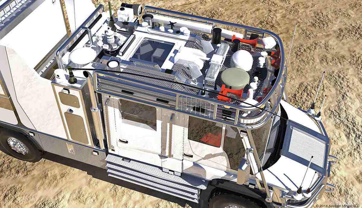 وستكون الإطارات التقليدية خطأ كبير علي هذه النوعية من المركبات ، لأنك قد تتخيل ما سيحدث لو ثقب الإطار علي مسافة كبيرة داخل الصحراء. ولذلك فقد زودت السيارة بإطارات قياس 46 بوصة مع أجزاء تشبه الأجزاء المدرعة في سيارات الجيش. ويوجد في الجزء الخلفي للسيارة مولد كهربائي ديزل بقوة 25 كيلوواط هاديء للغاية ، كما تجهز السيارة بمكتب جيولوجي للأبحاث ومطبخ مجهز بالكامل. كما توجد بالمركبة منطقة نوم لثلاثة أشخاص .