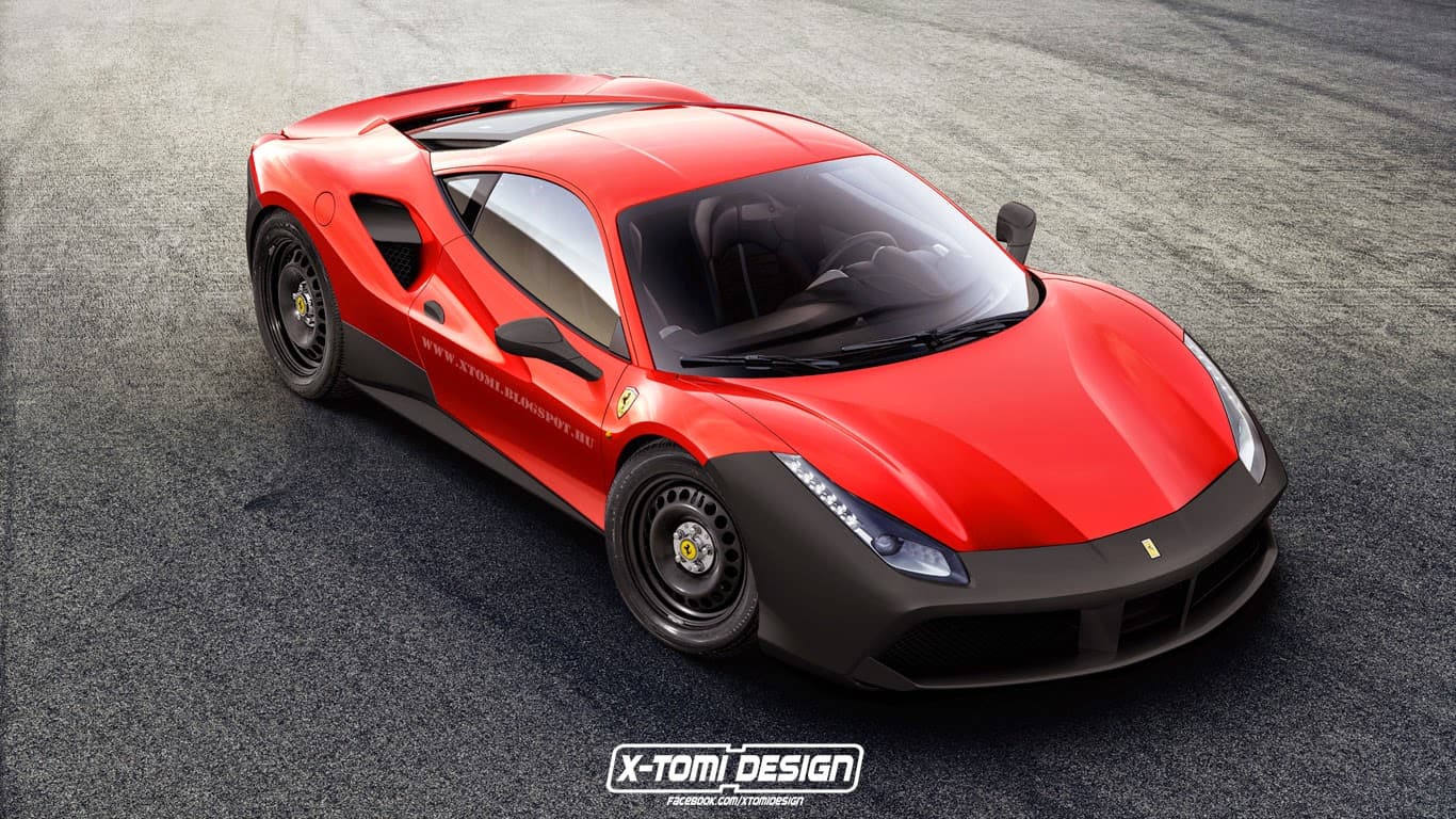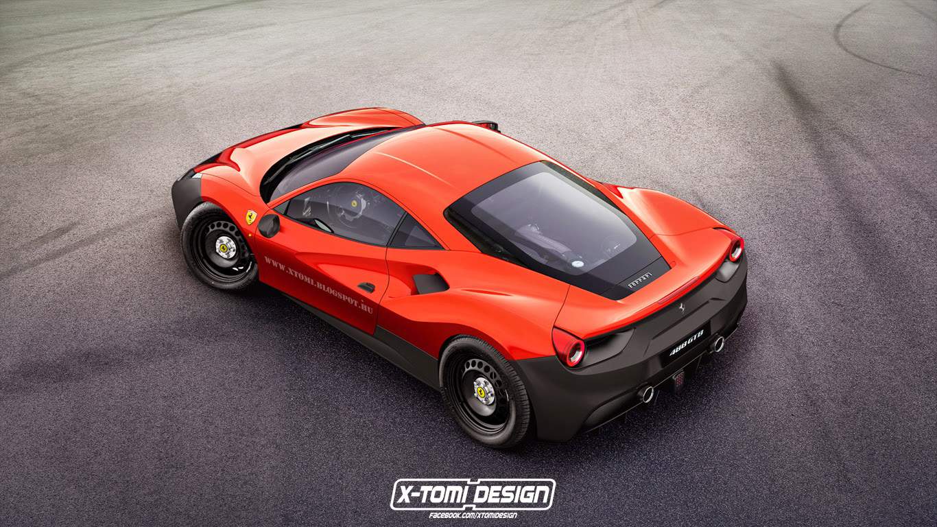 وقد صمم هذه السيارة المصمم الرقمي X-Tomi الذي كان فضولياً لمعرفة كيف ستأتي فيراري 488 GTB بعجلات من الصلب وصادم أسود في الأمام والخلف لذلك قدم لنا هاتين الصورتين التخيليتين للسيارة بأغطية مرايا بلاستيكية سوداء مع عتبات ومقابض أبواب بنفس اللمسات. ورغم أن هذه المجموعة من التفاصيل تبدو قبيحة ، فإن السيارة لا تزال تبدو رائعة الشكل .