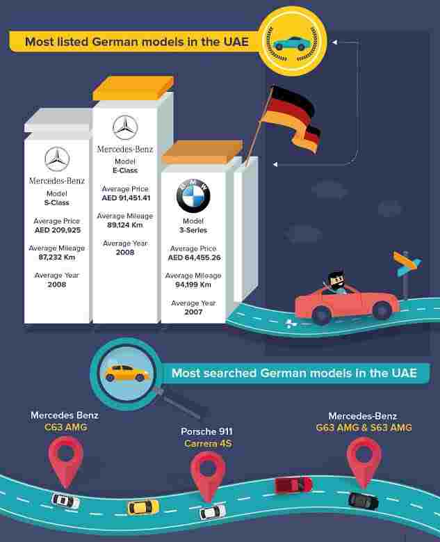 وقد أوضح الانفوجرافيك أن الموديلات الألمانية الأولي في البحث في الإمارات هي مرسيدس S-Class وBMW الفئة الثالثة وتتركز موديلات البحث في مرسيدس C63 وبورشه 911 4S ومرسيدس G63 & S63 AMG. أما السيارات المكشوفة ، فتركز البحث عنها في ميني كوبر مكشوفة وأودي A4 المكشوفة وBMW M3 المكشوفة. أما أكثر السيارات التي تم البحث عنها العام الماضي فهي BMW الفئة الثالثة ثم لاندروفر رانج روفر HSE وجيب رانجلر.
