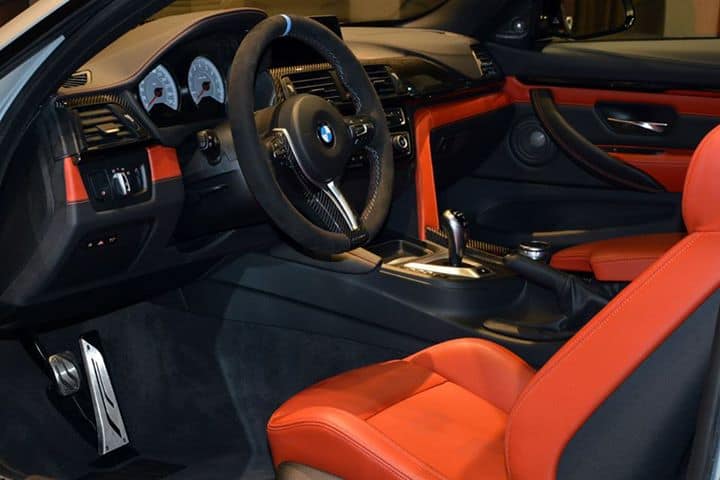 أما مقصورة السيارة ، فإن السيارة الكوبيه عالية الأداء تحمل فرش جلدي أحمر اللون لامع مع تطريز مختلف بجانب العديد من المكونات الأخري التي تحمل علامة M مثل عجلة القيادة وتطعيمات ألياف الكربون.