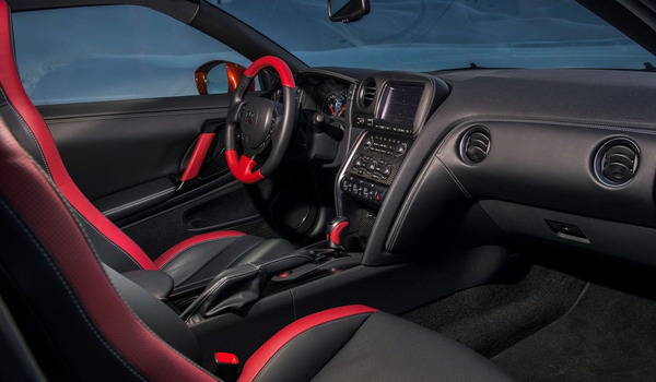 وحصلت GT-R كذلك على حياكة بارزة للمقاعد، مع شعارات GT-R على المقاعد، مع الابقاء على العدادات ذات الخلفية الشبيهة بالكاربون فايبر، وتطعيمات الكاربون فايبر في الكونسول الوسطي، وشاشة المعلومات الوسطية الكبيرة التي تستعرض لك كافة المعلومات عن أداء السيارة بتصميم مستوحى من لعبة جران توريزمو الشهيرة.