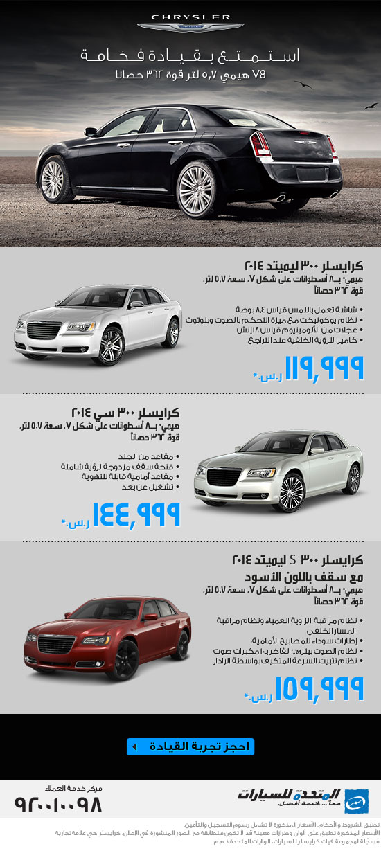 السيارات- أعلنت المتحدة للسيارات، وكيل كرايسلر في المملكة، عن عرض جديد على سيارة كرايسلر 300 طرازات عام 2014.