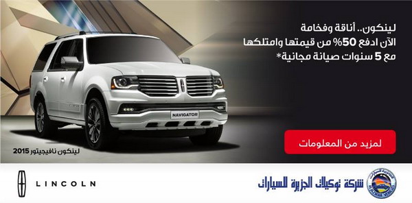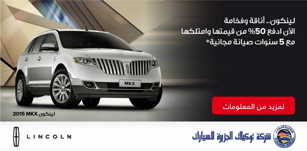 السيارات- أعلنت شركة توكيلات الجزيرة للسيارات عن عرض جديد على سيارات لينكولن الفخمة. حيث يتيح لك العرض الحصول على أي من سيارات الشركة بدفع 50% فقط من قيمتها ومن ثم تملكها، ودفع الباقي من خلال تسهيلات تقدمها الشركة.