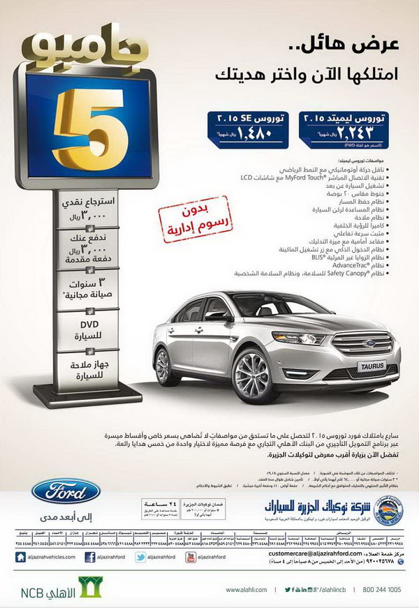 السيارات- أعلنت شركة توكيلات الجزيرة وكيل فورد في المملكة، عن عرض جديد على سيارتها السيدان توروس بالتعاون مع البنك الاهلى NCB.