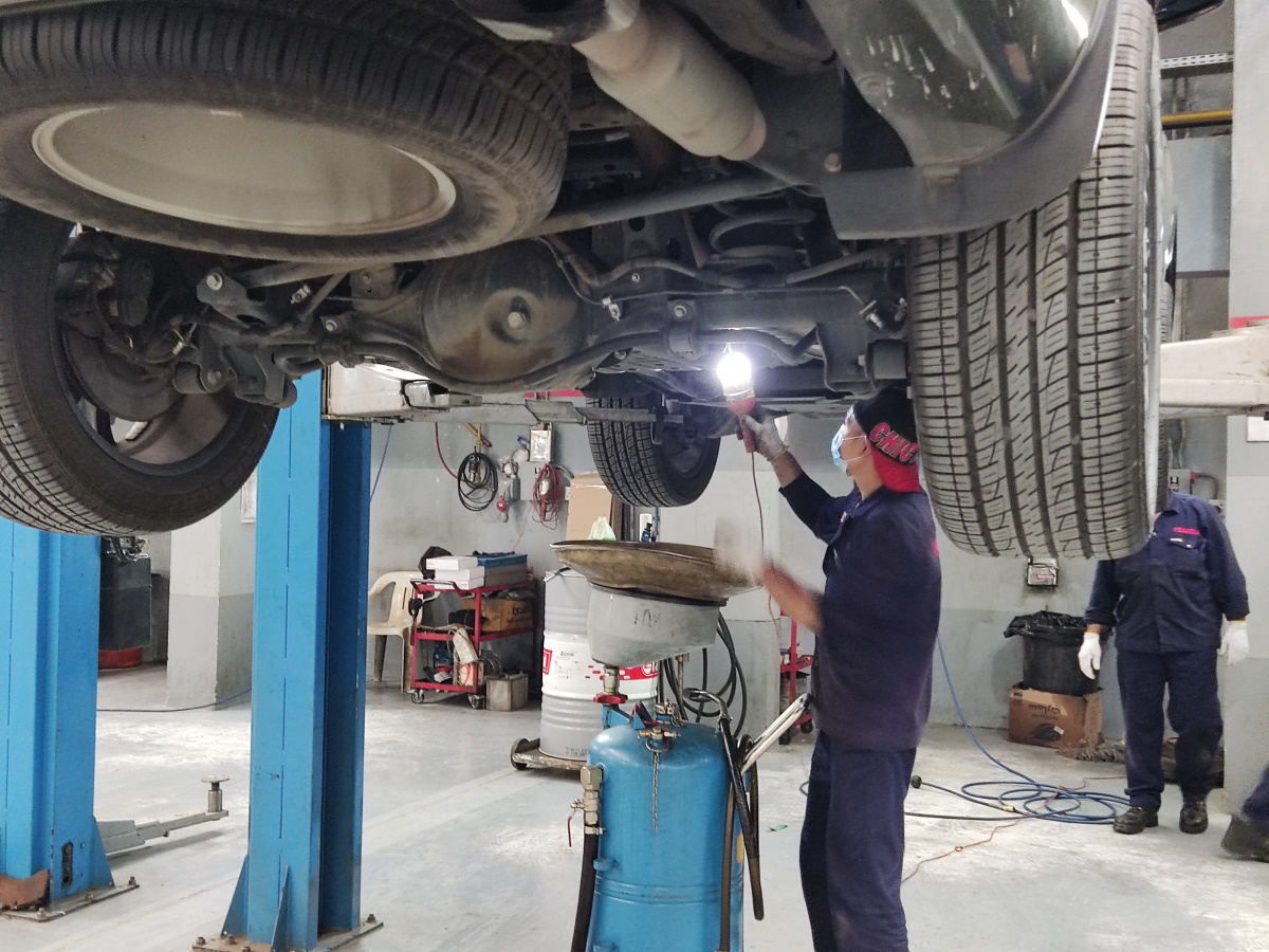 الفني يقوم بعملية الفحص لأنظمة التعليق وفحص هيكل السيارة ثم يتم تغيير سوائل وزيوت السيارة