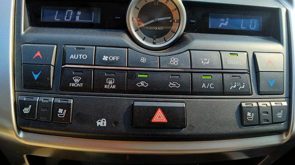 تكييف ثنائي المناطق وساعه كلاسيكيه تتوسط المفاتيح وفي الاسفل مفاتيح تبريد وتدفئة المقاعد الاماميه