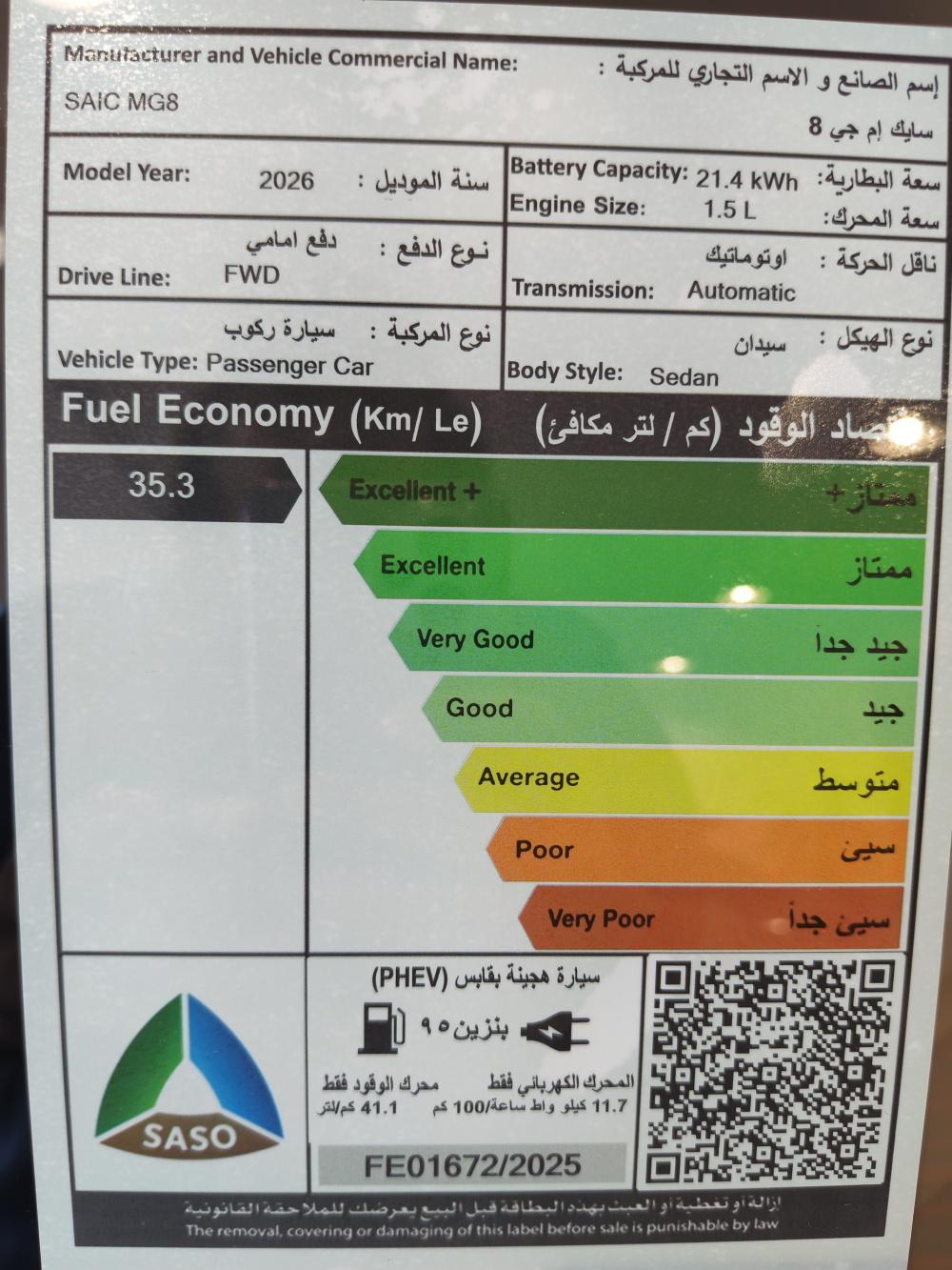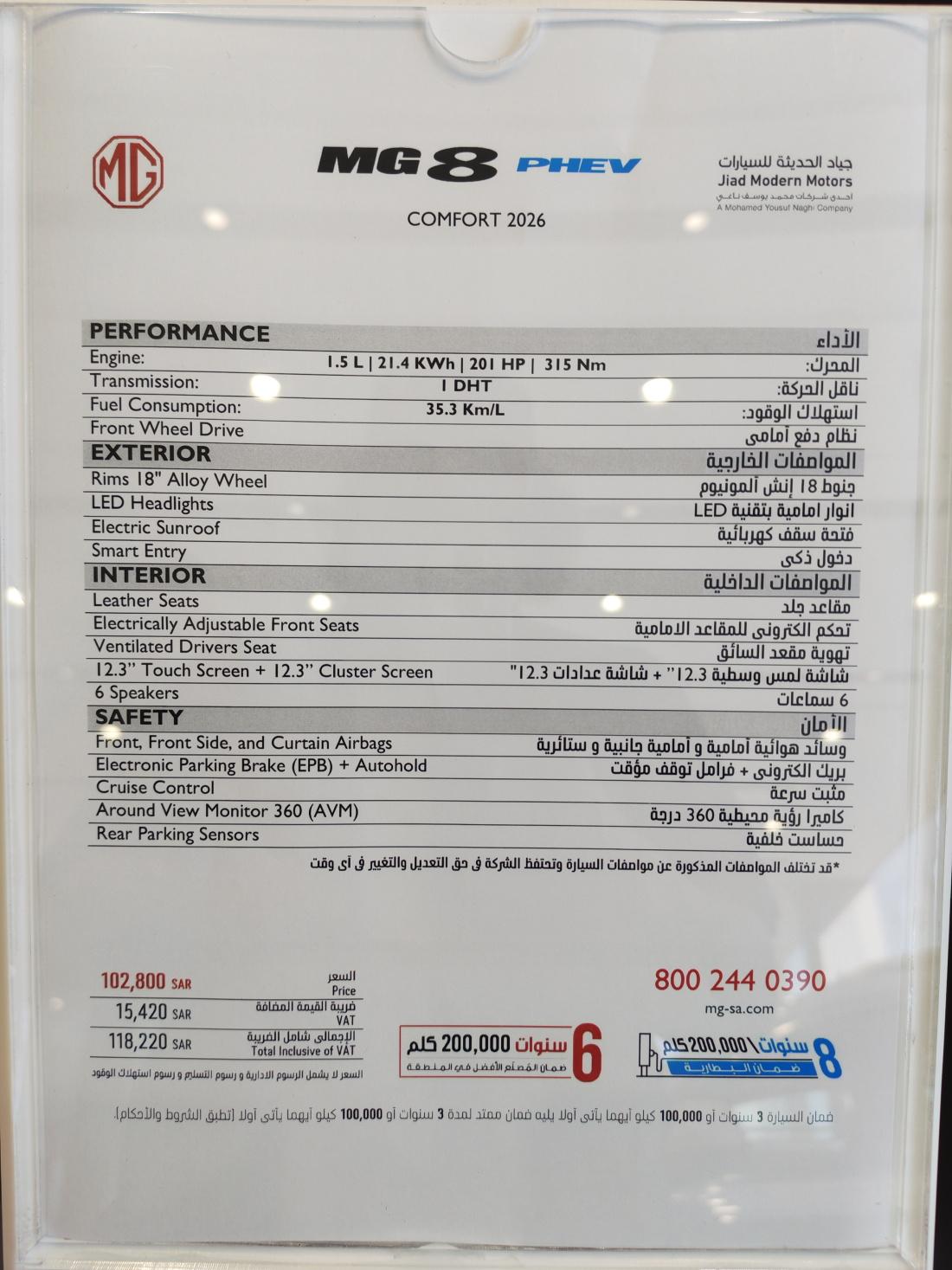 وصلت سيارة MG8 الجديدة لدى صالات جياد الحديثة السيدان الجديدة تأتي بنظامي الهجين والكهرباء وبمدى يتعدى الالف كيلو متر لتدخل في منافسة على كفاءة الطاقة مع السيارات الأخرى المنافسة في سباق جديد على السيارة الافضل في استهلاك الوقود تتوفر السيارة بفئتين وبسعر يصل الى 118 الف للفئة العليا
