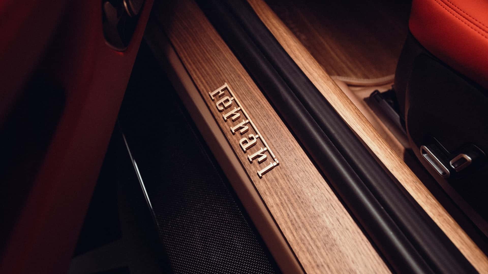 ولكن يبقى التجهيز الأكثر إثارة هو الخشب، إذ قامت فيراري بتوريد خشب من أصل متحكم فيه لغطاء الصندوق الخلفي، والعتبات الجانبية، والأرضية الخلفية. حتى أن سجادات الأرضية الأمامية تأتي مع نسيج خشبي متطابق، والعتبات الخشبية بشعارات فيراري الذهبية على كلا الجانبين.
